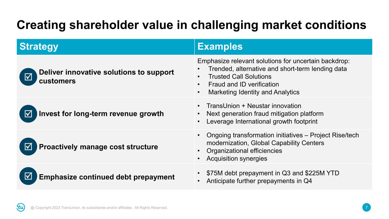 6@ Copyright 2023 TransUnion, its subsidiaries and/or affiliates. All Rights Reserved. Neustar driving growth at scale within our U.S. Markets • Subscription indicators remain strong – pipeline, bookings, renewals – Q3 growth led by Communications and Marketing – Lower usage-based revenue within Marketing (audience building, campaign planning) and Fraud • New Marketing wins with several blue-chip brands (CPG, apparel, personal care) • Trusted Call Solutions driving rapid adoption – Expanded relationship with top three wireless carrier to become exclusive provider for delivering Branded Calling – Won multimillion-dollar Public Sector contract For additional information, refer to the “Non-GAAP Financial Information” section on slide 2 and the Appendix at the back of this investor presentation. Financial results • Q3 2023: ~7% revenue growth • Expecting mid-single digit revenue growth in 2023 due to softening usage- based volumes • Expecting ~31% Adjusted EBITDA margin for 2023
