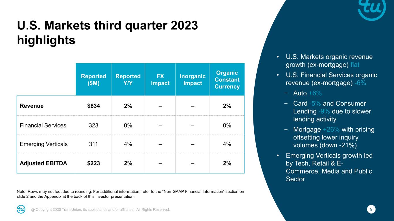 8@ Copyright 2023 TransUnion, its subsidiaries and/or affiliates. All Rights Reserved. Consolidated third quarter 2023 highlights For additional information, refer to the “Non-GAAP Financial Information” section on slide 2 and the Appendix at the back of this investor presentation. Reported ($M) Y/Y Change Revenue $969 3% Organic Constant Currency Revenue 3% Adjusted EBITDA $356 5% Adjusted EBITDA Margin 36.8% 50bps Adjusted Diluted EPS $0.91 (2)% • Organic constant currency revenue growth of +3%, or +2% excluding mortgage