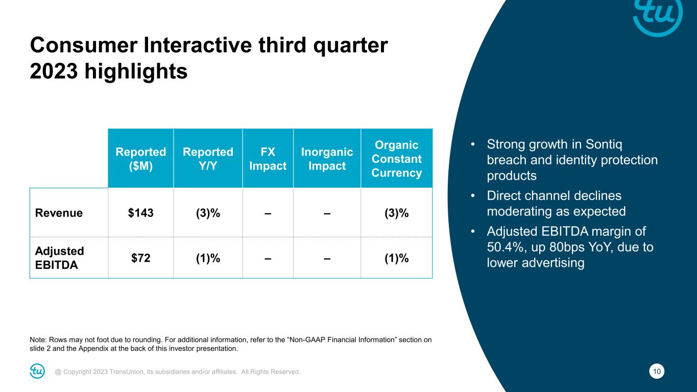 9@ Copyright 2023 TransUnion, its subsidiaries and/or affiliates. All Rights Reserved. U.S. Markets third quarter 2023 highlights Note: Rows may not foot due to rounding. For additional information, refer to the “Non-GAAP Financial Information” section on slide 2 and the Appendix at the back of this investor presentation. • U.S. Markets organic revenue growth (ex-mortgage) flat • U.S. Financial Services organic revenue (ex-mortgage) -6% − Auto +6% − Card -5% and Consumer Lending -9% due to slower lending activity − Mortgage +26% with pricing offsetting lower inquiry volumes (down -21%) • Emerging Verticals growth led by Tech, Retail & E- Commerce, Media and Public Sector Reported ($M) Reported Y/Y FX Impact Inorganic Impact Organic Constant Currency Revenue $634 2% – – 2% Financial Services 323 0% – – 0% Emerging Verticals 311 4% – – 4% Adjusted EBITDA $223 2% – – 2%