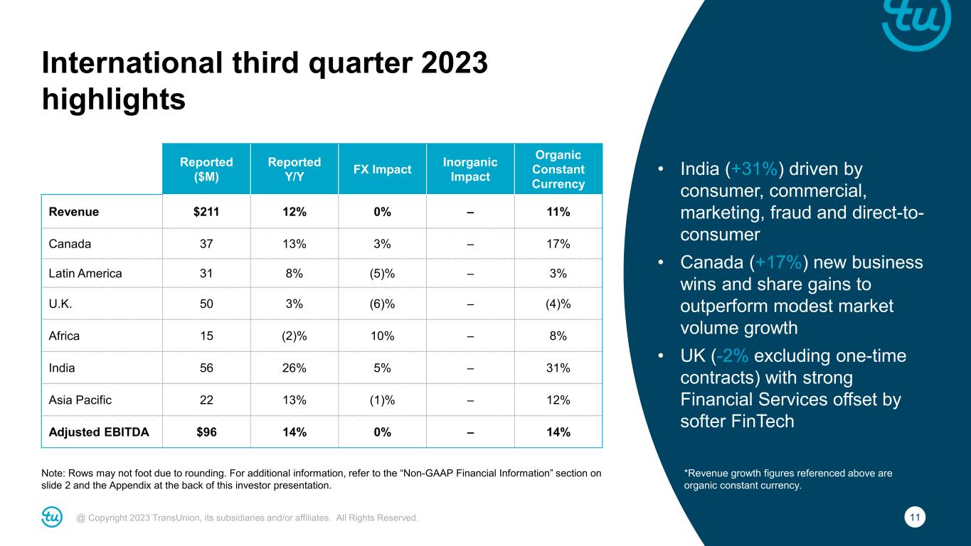 10@ Copyright 2023 TransUnion, its subsidiaries and/or affiliates. All Rights Reserved. Consumer Interactive third quarter 2023 highlights Note: Rows may not foot due to rounding. For additional information, refer to the “Non-GAAP Financial Information” section on slide 2 and the Appendix at the back of this investor presentation. • Strong growth in Sontiq breach and identity protection products • Direct channel declines moderating as expected • Adjusted EBITDA margin of 50.4%, up 80bps YoY, due to lower advertising Reported ($M) Reported Y/Y FX Impact Inorganic Impact Organic Constant Currency Revenue $143 (3)% – – (3)% Adjusted EBITDA $72 (1)% – – (1)%