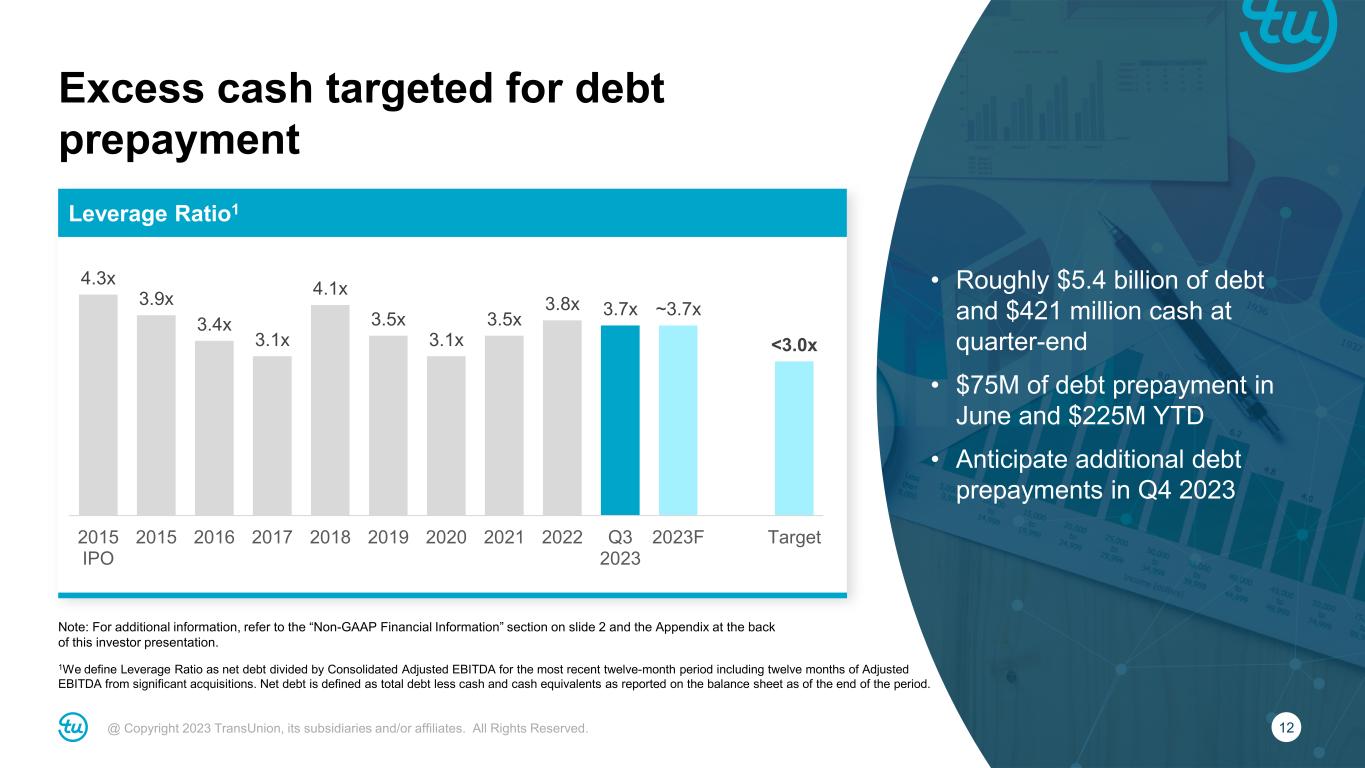 11@ Copyright 2023 TransUnion, its subsidiaries and/or affiliates. All Rights Reserved. International third quarter 2023 highlights Note: Rows may not foot due to rounding. For additional information, refer to the “Non-GAAP Financial Information” section on slide 2 and the Appendix at the back of this investor presentation. • India (+31%) driven by consumer, commercial, marketing, fraud and direct-to- consumer • Canada (+17%) new business wins and share gains to outperform modest market volume growth • UK (-2% excluding one-time contracts) with strong Financial Services offset by softer FinTech Reported ($M) Reported Y/Y FX Impact Inorganic Impact Organic Constant Currency Revenue $211 12% 0% – 11% Canada 37 13% 3% – 17% Latin America 31 8% (5)% – 3% U.K. 50 3% (6)% – (4)% Africa 15 (2)% 10% – 8% India 56 26% 5% – 31% Asia Pacific 22 13% (1)% – 12% Adjusted EBITDA $96 14% 0% – 14% *Revenue growth figures referenced above are organic constant currency.