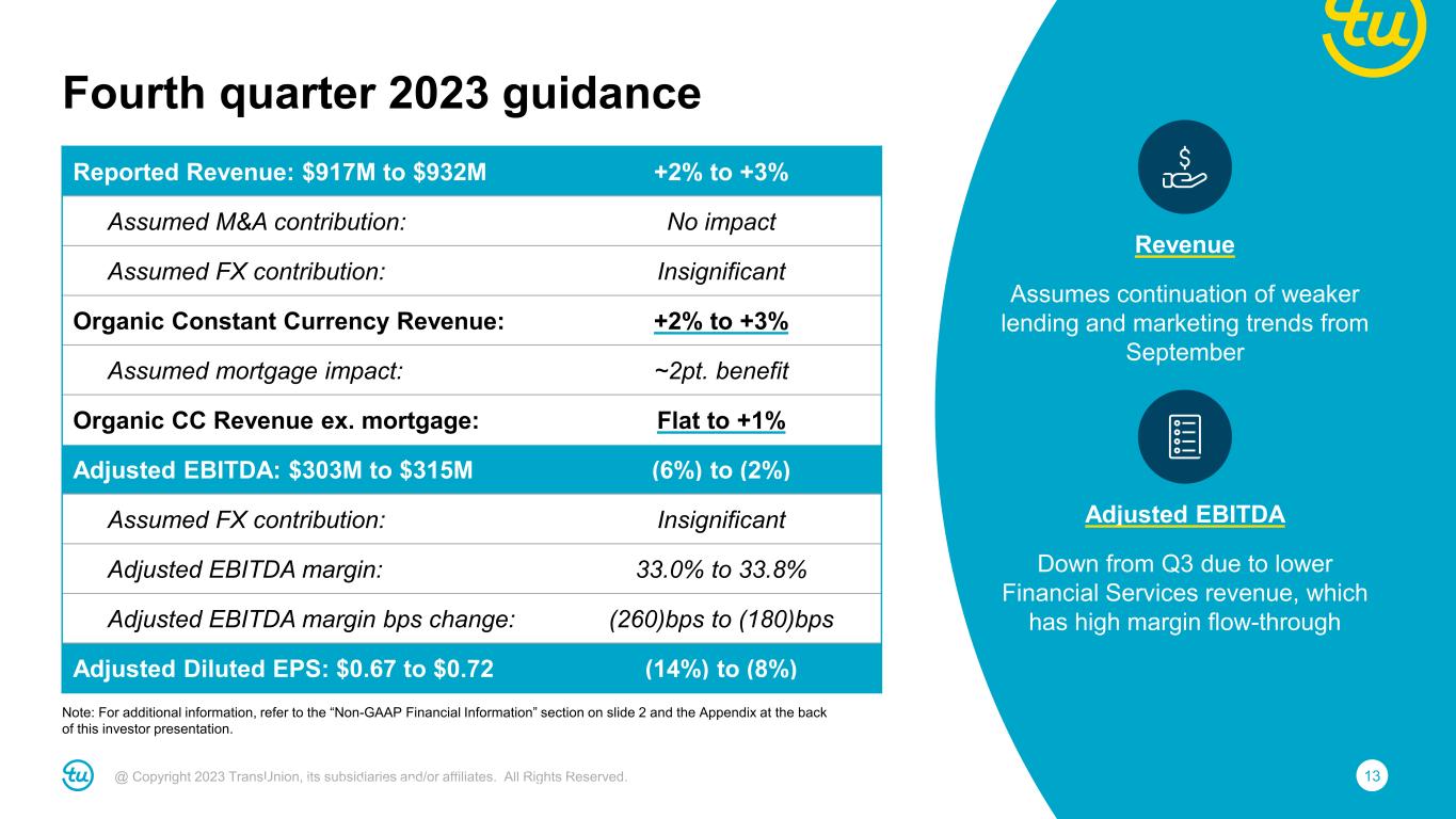 12@ Copyright 2023 TransUnion, its subsidiaries and/or affiliates. All Rights Reserved. • Roughly $5.4 billion of debt and $421 million cash at quarter-end • $75M of debt prepayment in June and $225M YTD • Anticipate additional debt prepayments in Q4 2023 1We define Leverage Ratio as net debt divided by Consolidated Adjusted EBITDA for the most recent twelve-month period including twelve months of Adjusted EBITDA from significant acquisitions. Net debt is defined as total debt less cash and cash equivalents as reported on the balance sheet as of the end of the period. Note: For additional information, refer to the “Non-GAAP Financial Information” section on slide 2 and the Appendix at the back of this investor presentation. Excess cash targeted for debt prepayment Leverage Ratio1 4.3x 3.9x 3.4x 3.1x 4.1x 3.5x 3.1x 3.5x 3.8x 3.7x ~3.7x <3.0x 2015 IPO 2015 2016 2017 2018 2019 2020 2021 2022 Q3 2023 2023F Target