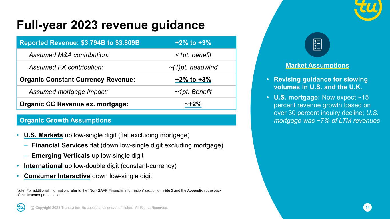 13@ Copyright 2023 TransUnion, its subsidiaries and/or affiliates. All Rights Reserved. Reported Revenue: $917M to $932M +2% to +3% Assumed M&A contribution: No impact Assumed FX contribution: Insignificant Organic Constant Currency Revenue: +2% to +3% Assumed mortgage impact: ~2pt. benefit Organic CC Revenue ex. mortgage: Flat to +1% Adjusted EBITDA: $303M to $315M (6%) to (2%) Assumed FX contribution: Insignificant Adjusted EBITDA margin: 33.0% to 33.8% Adjusted EBITDA margin bps change: (260)bps to (180)bps Adjusted Diluted EPS: $0.67 to $0.72 (14%) to (8%) Note: For additional information, refer to the “Non-GAAP Financial Information” section on slide 2 and the Appendix at the back of this investor presentation. Revenue Fourth quarter 2023 guidance Assumes continuation of weaker lending and marketing trends from September Adjusted EBITDA Down from Q3 due to lower Financial Services revenue, which has high margin flow-through Note: For additional information, refer to the “Non-GAAP Financial Information” section on slide 2 and the Appendix at the back of this investor presentation.