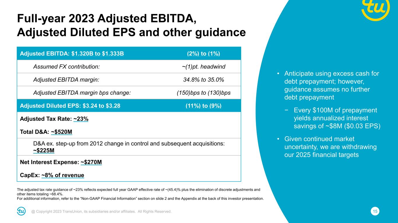 14@ Copyright 2023 TransUnion, its subsidiaries and/or affiliates. All Rights Reserved. Organic Growth Assumptions • Revising guidance for slowing volumes in U.S. and the U.K. • U.S. mortgage: Now expect ~15 percent revenue growth based on over 30 percent inquiry decline; U.S. mortgage was ~7% of LTM revenues Note: For additional information, refer to the “Non-GAAP Financial Information” section on slide 2 and the Appendix at the back of this investor presentation. Full-year 2023 revenue guidance Reported Revenue: $3.794B to $3.809B +2% to +3% Assumed M&A contribution: <1pt. benefit Assumed FX contribution: ~(1)pt. headwind Organic Constant Currency Revenue: +2% to +3% Assumed mortgage impact: ~1pt. Benefit Organic CC Revenue ex. mortgage: ~+2% Market Assumptions • U.S. Markets up low-single digit (flat excluding mortgage) – Financial Services flat (down low-single digit excluding mortgage) – Emerging Verticals up low-single digit • International up low-double digit (constant-currency) • Consumer Interactive down low-single digit Note: For additional information, refer to the “Non-GAAP Financial Information” section on slide 2 and the Appendix at the back of this investor presentation.