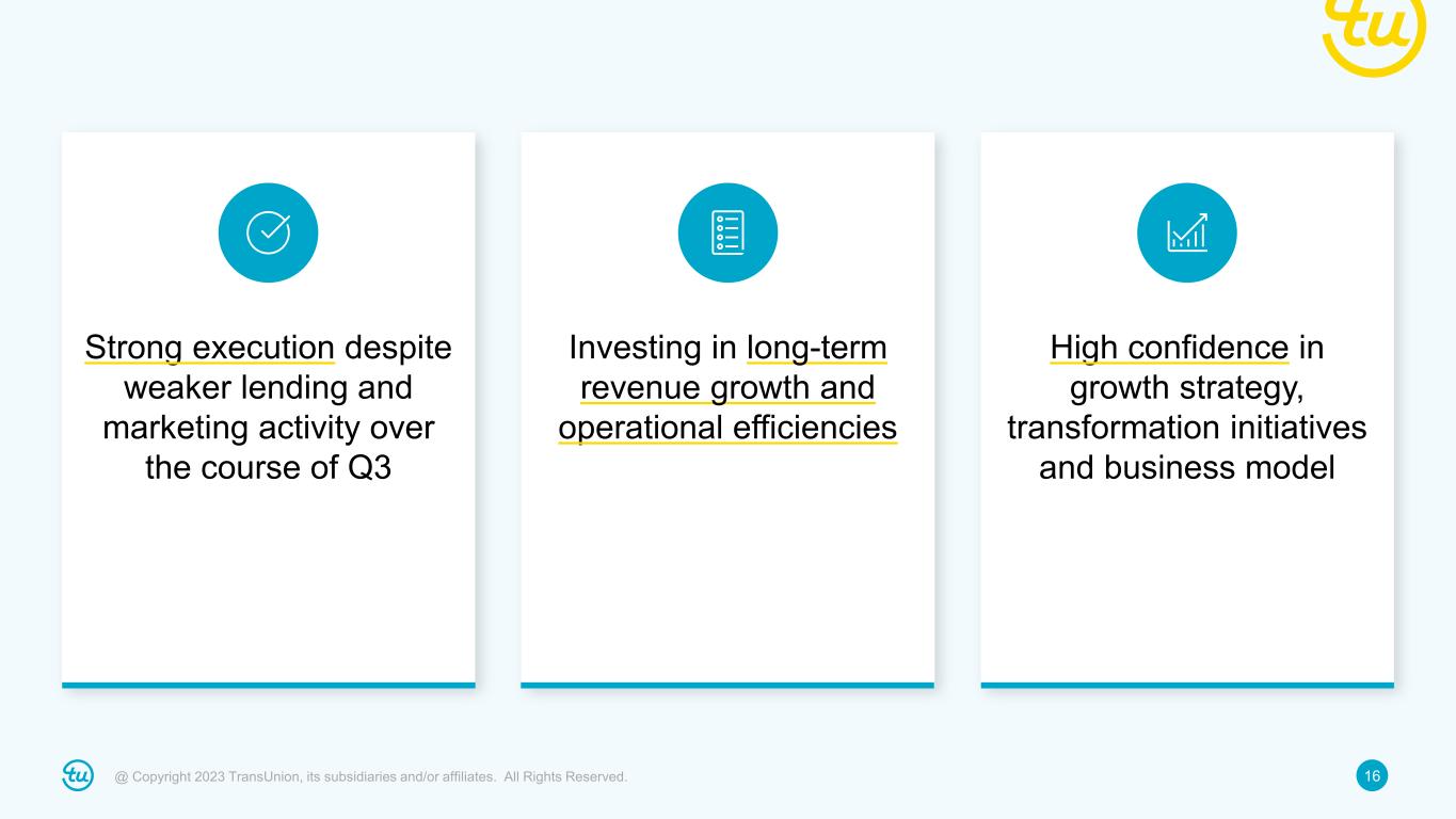 15@ Copyright 2023 TransUnion, its subsidiaries and/or affiliates. All Rights Reserved. • Anticipate using excess cash for debt prepayment; however, guidance assumes no further debt prepayment − Every $100M of prepayment yields annualized interest savings of ~$8M ($0.03 EPS) • Given continued market uncertainty, we are withdrawing our 2025 financial targets The adjusted tax rate guidance of ~23% reflects expected full year GAAP effective rate of ~(45.4)% plus the elimination of discrete adjustments and other items totaling ~68.4%. For additional information, refer to the “Non-GAAP Financial Information” section on slide 2 and the Appendix at the back of this investor presentation. Full-year 2023 Adjusted EBITDA, Adjusted Diluted EPS and other guidance Adjusted EBITDA: $1.320B to $1.333B (2%) to (1%) Assumed FX contribution: ~(1)pt. headwind Adjusted EBITDA margin: 34.8% to 35.0% Adjusted EBITDA margin bps change: (150)bps to (130)bps Adjusted Diluted EPS: $3.24 to $3.28 (11%) to (9%) Adjusted Tax Rate: ~23% Total D&A: ~$520M D&A ex. step-up from 2012 change in control and subsequent acquisitions: ~$225M Net Interest Expense: ~$270M CapEx: ~8% of revenue