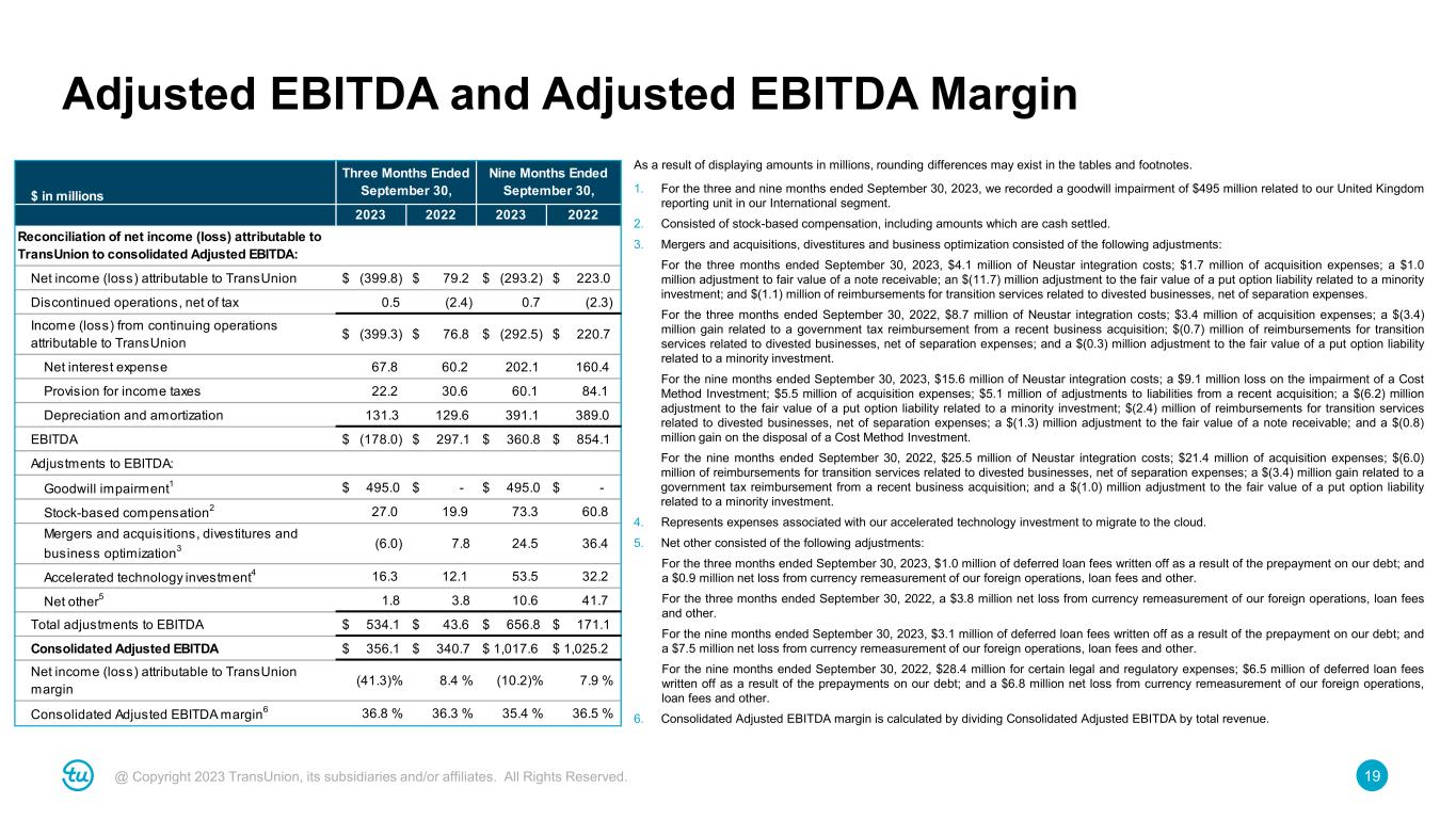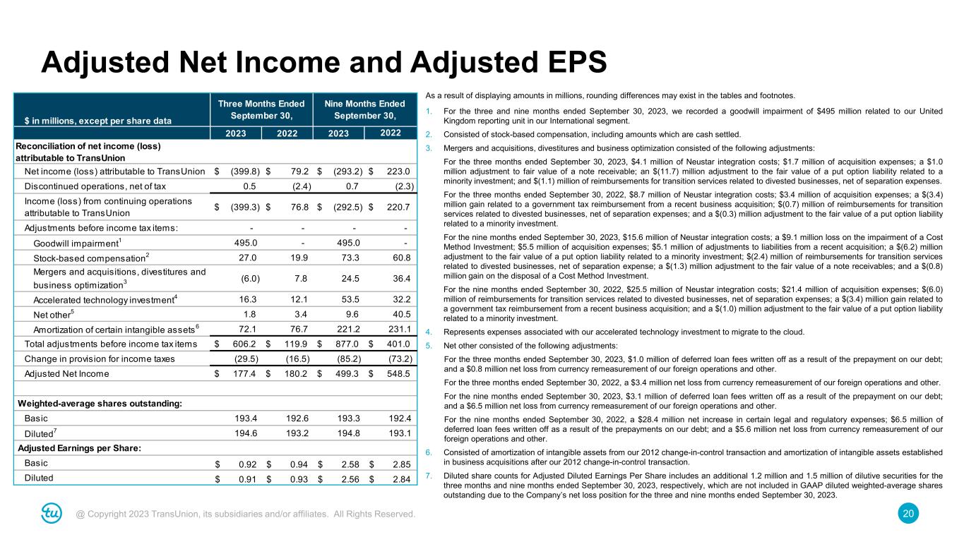19@ Copyright 2023 TransUnion, its subsidiaries and/or affiliates. All Rights Reserved. Adjusted EBITDA and Adjusted EBITDA Margin As a result of displaying amounts in millions, rounding differences may exist in the tables and footnotes. 1. For the three and nine months ended September 30, 2023, we recorded a goodwill impairment of $495 million related to our United Kingdom reporting unit in our International segment. 2. Consisted of stock-based compensation, including amounts which are cash settled. 3. Mergers and acquisitions, divestitures and business optimization consisted of the following adjustments: For the three months ended September 30, 2023, $4.1 million of Neustar integration costs; $1.7 million of acquisition expenses; a $1.0 million adjustment to fair value of a note receivable; an $(11.7) million adjustment to the fair value of a put option liability related to a minority investment; and $(1.1) million of reimbursements for transition services related to divested businesses, net of separation expenses. For the three months ended September 30, 2022, $8.7 million of Neustar integration costs; $3.4 million of acquisition expenses; a $(3.4) million gain related to a government tax reimbursement from a recent business acquisition; $(0.7) million of reimbursements for transition services related to divested businesses, net of separation expenses; and a $(0.3) million adjustment to the fair value of a put option liability related to a minority investment. For the nine months ended September 30, 2023, $15.6 million of Neustar integration costs; a $9.1 million loss on the impairment of a Cost Method Investment; $5.5 million of acquisition expenses; $5.1 million of adjustments to liabilities from a recent acquisition; a $(6.2) million adjustment to the fair value of a put option liability related to a minority investment; $(2.4) million of reimbursements for transition services related to divested businesses, net of separation expenses; a $(1.3) million adjustment to the fair value of a note receivable; and a $(0.8) million gain on the disposal of a Cost Method Investment. For the nine months ended September 30, 2022, $25.5 million of Neustar integration costs; $21.4 million of acquisition expenses; $(6.0) million of reimbursements for transition services related to divested businesses, net of separation expenses; a $(3.4) million gain related to a government tax reimbursement from a recent business acquisition; and a $(1.0) million adjustment to the fair value of a put option liability related to a minority investment. 4. Represents expenses associated with our accelerated technology investment to migrate to the cloud. 5. Net other consisted of the following adjustments: For the three months ended September 30, 2023, $1.0 million of deferred loan fees written off as a result of the prepayment on our debt; and a $0.9 million net loss from currency remeasurement of our foreign operations, loan fees and other. For the three months ended September 30, 2022, a $3.8 million net loss from currency remeasurement of our foreign operations, loan fees and other. For the nine months ended September 30, 2023, $3.1 million of deferred loan fees written off as a result of the prepayment on our debt; and a $7.5 million net loss from currency remeasurement of our foreign operations, loan fees and other. For the nine months ended September 30, 2022, $28.4 million for certain legal and regulatory expenses; $6.5 million of deferred loan fees written off as a result of the prepayments on our debt; and a $6.8 million net loss from currency remeasurement of our foreign operations, loan fees and other. 6. Consolidated Adjusted EBITDA margin is calculated by dividing Consolidated Adjusted EBITDA by total revenue. $ in millions 2023 2022 2023 Reconciliation of net income (loss) attributable to TransUnion to consolidated Adjusted EBITDA: Net income (loss) attributable to TransUnion $ (399.8) $ 79.2 $ (293.2) $ 223.0 Discontinued operations, net of tax 0.5 (2.4) 0.7 (2.3) Income (loss) from continuing operations attributable to TransUnion $ (399.3) $ 76.8 $ (292.5) $ 220.7 Net interest expense 67.8 60.2 202.1 160.4 Provision for income taxes 22.2 30.6 60.1 84.1 Depreciation and amortization 131.3 129.6 391.1 389.0 EBITDA $ (178.0) $ 297.1 $ 360.8 $ 854.1 Adjustments to EBITDA: Goodwill impairment1 $ 495.0 $ - $ 495.0 $ - Stock-based compensation2 27.0 19.9 73.3 60.8 Mergers and acquisitions, divestitures and business optimization3 (6.0) 7.8 24.5 36.4 Accelerated technology investment4 16.3 12.1 53.5 32.2 Net other5 1.8 3.8 10.6 41.7 Total adjustments to EBITDA $ 534.1 $ 43.6 $ 656.8 $ 171.1 Consolidated Adjusted EBITDA $ 356.1 $ 340.7 $ 1,017.6 $ 1,025.2 Net income (loss) attributable to TransUnion margin (41.3)% 8.4 % (10.2)% 7.9 % Consolidated Adjusted EBITDA margin6 36.8 % 36.3 % 35.4 % 36.5 % Three Months Ended September 30, Nine Months Ended September 30, 2022