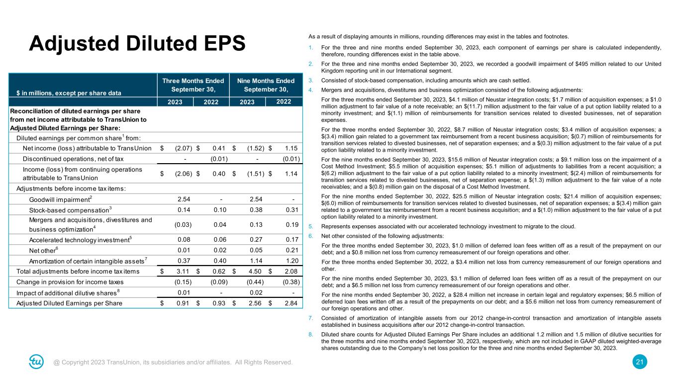 20@ Copyright 2023 TransUnion, its subsidiaries and/or affiliates. All Rights Reserved. Adjusted Net Income and Adjusted EPS As a result of displaying amounts in millions, rounding differences may exist in the tables and footnotes. 1. For the three and nine months ended September 30, 2023, we recorded a goodwill impairment of $495 million related to our United Kingdom reporting unit in our International segment. 2. Consisted of stock-based compensation, including amounts which are cash settled. 3. Mergers and acquisitions, divestitures and business optimization consisted of the following adjustments: For the three months ended September 30, 2023, $4.1 million of Neustar integration costs; $1.7 million of acquisition expenses; a $1.0 million adjustment to fair value of a note receivable; an $(11.7) million adjustment to the fair value of a put option liability related to a minority investment; and $(1.1) million of reimbursements for transition services related to divested businesses, net of separation expenses. For the three months ended September 30, 2022, $8.7 million of Neustar integration costs; $3.4 million of acquisition expenses; a $(3.4) million gain related to a government tax reimbursement from a recent business acquisition; $(0.7) million of reimbursements for transition services related to divested businesses, net of separation expenses; and a $(0.3) million adjustment to the fair value of a put option liability related to a minority investment. For the nine months ended September 30, 2023, $15.6 million of Neustar integration costs; a $9.1 million loss on the impairment of a Cost Method Investment; $5.5 million of acquisition expenses; $5.1 million of adjustments to liabilities from a recent acquisition; a $(6.2) million adjustment to the fair value of a put option liability related to a minority investment; $(2.4) million of reimbursements for transition services related to divested businesses, net of separation expense; a $(1.3) million adjustment to the fair value of a note receivables; and a $(0.8) million gain on the disposal of a Cost Method Investment. For the nine months ended September 30, 2022, $25.5 million of Neustar integration costs; $21.4 million of acquisition expenses; $(6.0) million of reimbursements for transition services related to divested businesses, net of separation expenses; a $(3.4) million gain related to a government tax reimbursement from a recent business acquisition; and a $(1.0) million adjustment to the fair value of a put option liability related to a minority investment. 4. Represents expenses associated with our accelerated technology investment to migrate to the cloud. 5. Net other consisted of the following adjustments: For the three months ended September 30, 2023, $1.0 million of deferred loan fees written off as a result of the prepayment on our debt; and a $0.8 million net loss from currency remeasurement of our foreign operations and other. For the three months ended September 30, 2022, a $3.4 million net loss from currency remeasurement of our foreign operations and other. For the nine months ended September 30, 2023, $3.1 million of deferred loan fees written off as a result of the prepayment on our debt; and a $6.5 million net loss from currency remeasurement of our foreign operations and other. For the nine months ended September 30, 2022, a $28.4 million net increase in certain legal and regulatory expenses; $6.5 million of deferred loan fees written off as a result of the prepayments on our debt; and a $5.6 million net loss from currency remeasurement of our foreign operations and other. 6. Consisted of amortization of intangible assets from our 2012 change-in-control transaction and amortization of intangible assets established in business acquisitions after our 2012 change-in-control transaction. 7. Diluted share counts for Adjusted Diluted Earnings Per Share includes an additional 1.2 million and 1.5 million of dilutive securities for the three months and nine months ended September 30, 2023, respectively, which are not included in GAAP diluted weighted-average shares outstanding due to the Company’s net loss position for the three and nine months ended September 30, 2023. $ in millions, except per share data 2023 2022 2023 Reconciliation of net income (loss) attributable to TransUnion Net income (loss) attributable to TransUnion $ (399.8) $ 79.2 $ (293.2) $ 223.0 Discontinued operations, net of tax 0.5 (2.4) 0.7 (2.3) Income (loss) from continuing operations attributable to TransUnion $ (399.3) $ 76.8 $ (292.5) $ 220.7 Adjustments before income tax items: - - - - Goodwill impairment1 495.0 - 495.0 - Stock-based compensation2 27.0 19.9 73.3 60.8 Mergers and acquisitions, divestitures and business optimization3 (6.0) 7.8 24.5 36.4 Accelerated technology investment4 16.3 12.1 53.5 32.2 Net other5 1.8 3.4 9.6 40.5 Amortization of certain intangible assets6 72.1 76.7 221.2 231.1 Total adjustments before income tax items $ 606.2 $ 119.9 $ 877.0 $ 401.0 Change in provision for income taxes (29.5) (16.5) (85.2) (73.2) Adjusted Net Income $ 177.4 $ 180.2 $ 499.3 $ 548.5 Weighted-average shares outstanding: Basic 193.4 192.6 193.3 192.4 Diluted7 194.6 193.2 194.8 193.1 Adjusted Earnings per Share: Basic 0.92$ 0.94$ 2.58$ 2.85$ Diluted 0.91$ 0.93$ 2.56$ 2.84$ Three Months Ended September 30, Nine Months Ended September 30, 2022