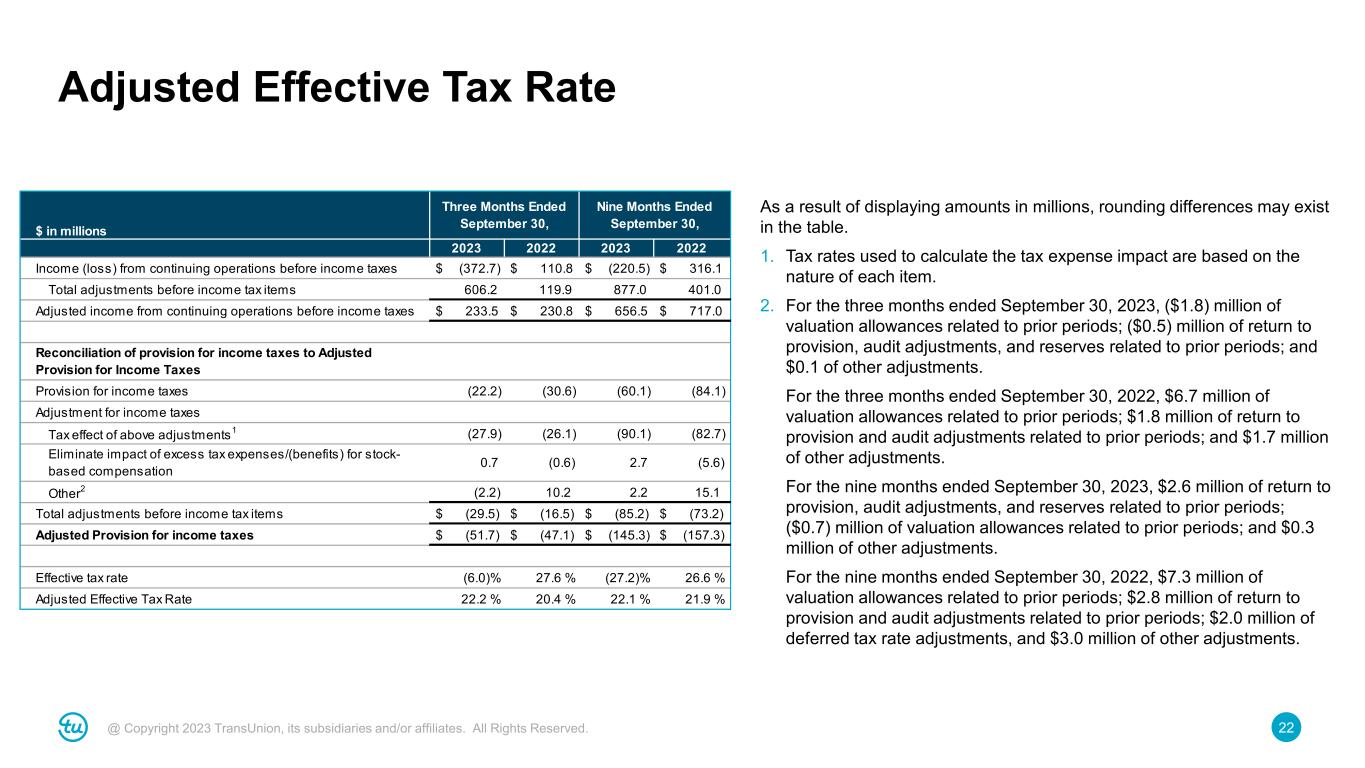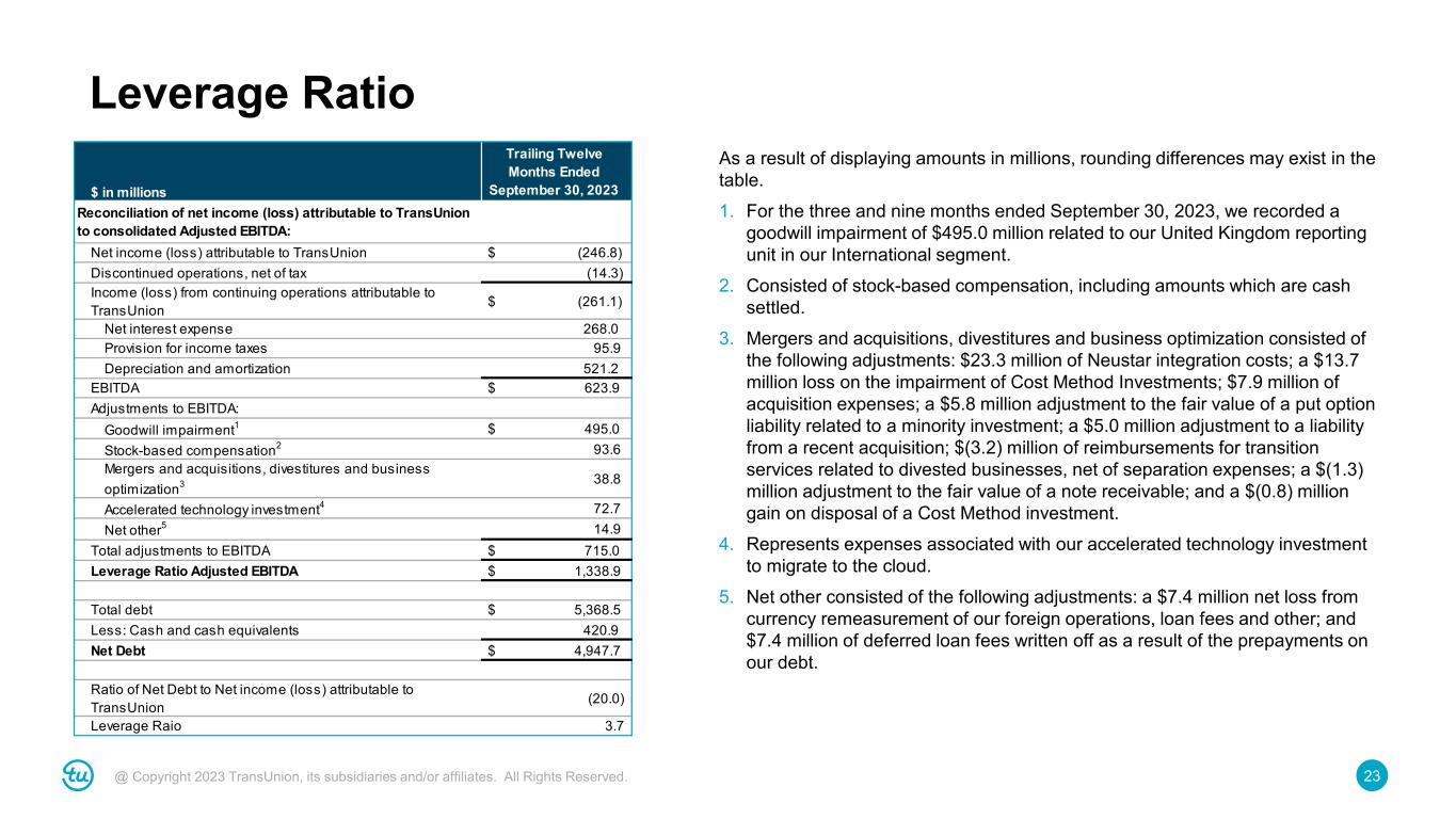 22@ Copyright 2023 TransUnion, its subsidiaries and/or affiliates. All Rights Reserved. Adjusted Effective Tax Rate As a result of displaying amounts in millions, rounding differences may exist in the table. 1. Tax rates used to calculate the tax expense impact are based on the nature of each item. 2. For the three months ended September 30, 2023, ($1.8) million of valuation allowances related to prior periods; ($0.5) million of return to provision, audit adjustments, and reserves related to prior periods; and $0.1 of other adjustments. • For the three months ended September 30, 2022, $6.7 million of valuation allowances related to prior periods; $1.8 million of return to provision and audit adjustments related to prior periods; and $1.7 million of other adjustments. • For the nine months ended September 30, 2023, $2.6 million of return to provision, audit adjustments, and reserves related to prior periods; ($0.7) million of valuation allowances related to prior periods; and $0.3 million of other adjustments. • For the nine months ended September 30, 2022, $7.3 million of valuation allowances related to prior periods; $2.8 million of return to provision and audit adjustments related to prior periods; $2.0 million of deferred tax rate adjustments, and $3.0 million of other adjustments. $ in millions 2023 2022 2023 Income (loss) from continuing operations before income taxes $ (372.7) $ 110.8 $ (220.5) $ 316.1 Total adjustments before income tax items 606.2 119.9 877.0 401.0 Adjusted income from continuing operations before income taxes $ 233.5 $ 230.8 $ 656.5 $ 717.0 Reconciliation of provision for income taxes to Adjusted Provision for Income Taxes Provision for income taxes (22.2) (30.6) (60.1) (84.1) Adjustment for income taxes Tax effect of above adjustments1 (27.9) (26.1) (90.1) (82.7) Eliminate impact of excess tax expenses/(benefits) for stock- based compensation 0.7 (0.6) 2.7 (5.6) Other2 (2.2) 10.2 2.2 15.1 Total adjustments before income tax items $ (29.5) $ (16.5) $ (85.2) $ (73.2) Adjusted Provision for income taxes $ (51.7) $ (47.1) $ (145.3) $ (157.3) Effective tax rate (6.0)% 27.6 % (27.2)% 26.6 % Adjusted Effective Tax Rate 22.2 % 20.4 % 22.1 % 21.9 % Three Months Ended September 30, Nine Months Ended September 30, 2022