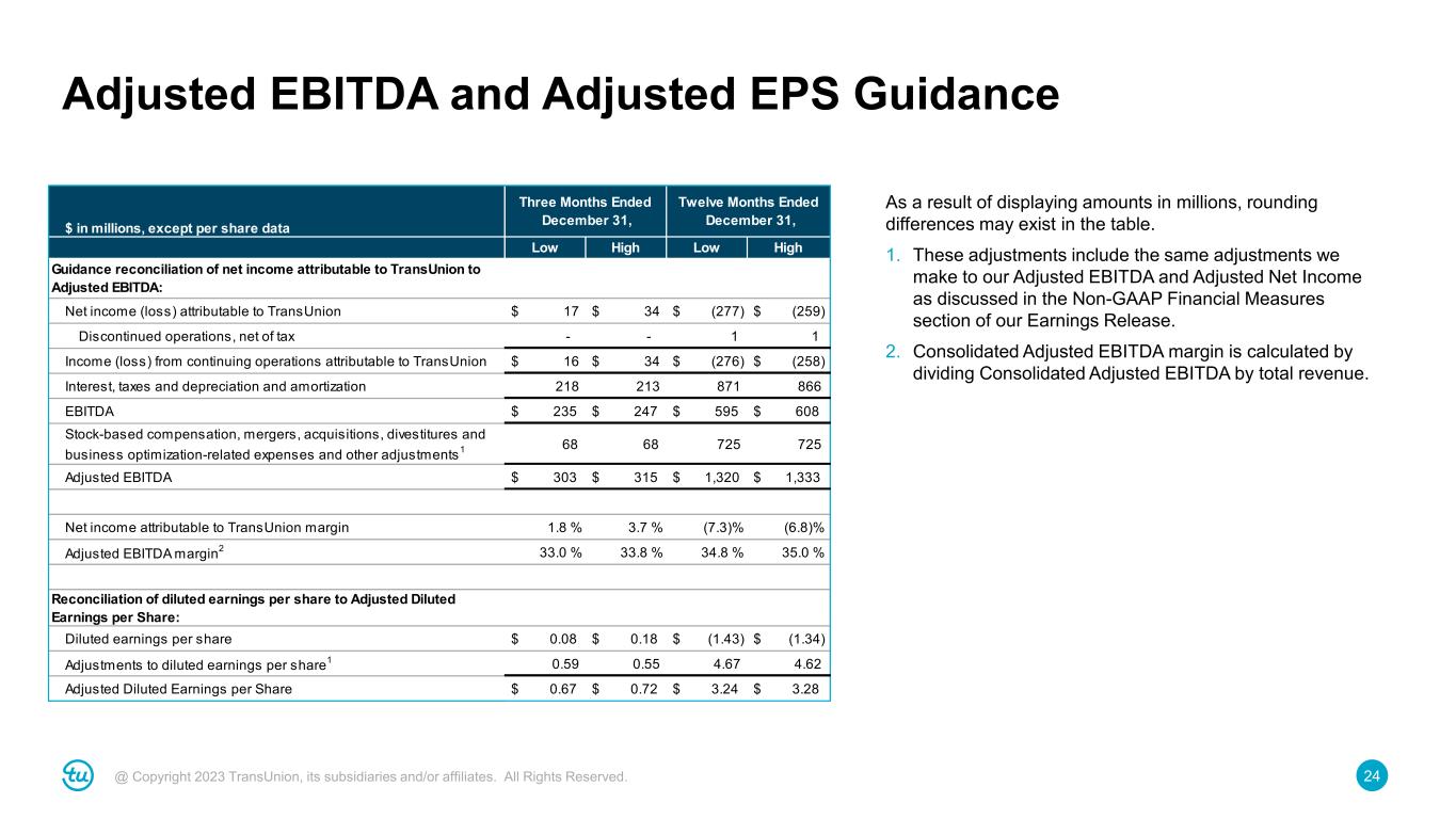 24@ Copyright 2023 TransUnion, its subsidiaries and/or affiliates. All Rights Reserved. Adjusted EBITDA and Adjusted EPS Guidance As a result of displaying amounts in millions, rounding differences may exist in the table. 1. These adjustments include the same adjustments we make to our Adjusted EBITDA and Adjusted Net Income as discussed in the Non-GAAP Financial Measures section of our Earnings Release. 2. Consolidated Adjusted EBITDA margin is calculated by dividing Consolidated Adjusted EBITDA by total revenue. $ in millions, except per share data Low High Low Guidance reconciliation of net income attributable to TransUnion to Adjusted EBITDA: Net income (loss) attributable to TransUnion $ 17 $ 34 $ (277) $ (259) Discontinued operations, net of tax - - 1 1 Income (loss) from continuing operations attributable to TransUnion $ 16 $ 34 $ (276) $ (258) Interest, taxes and depreciation and amortization 218 213 871 866 EBITDA $ 235 $ 247 $ 595 $ 608 Stock-based compensation, mergers, acquisitions, divestitures and business optimization-related expenses and other adjustments1 68 68 725 725 Adjusted EBITDA $ 303 $ 315 $ 1,320 $ 1,333 Net income attributable to TransUnion margin 1.8 % 3.7 % (7.3)% (6.8)% Adjusted EBITDA margin2 33.0 % 33.8 % 34.8 % 35.0 % Reconciliation of diluted earnings per share to Adjusted Diluted Earnings per Share: Diluted earnings per share $ 0.08 $ 0.18 $ (1.43) $ (1.34) Adjustments to diluted earnings per share1 0.59 0.55 4.67 4.62 Adjusted Diluted Earnings per Share $ 0.67 $ 0.72 $ 3.24 $ 3.28 Three Months Ended December 31, Twelve Months Ended December 31, High