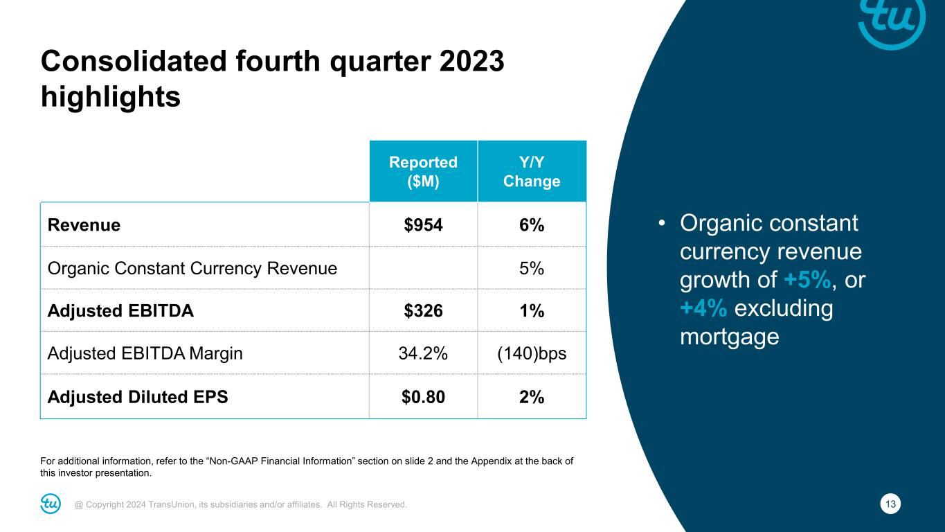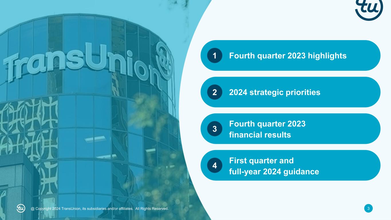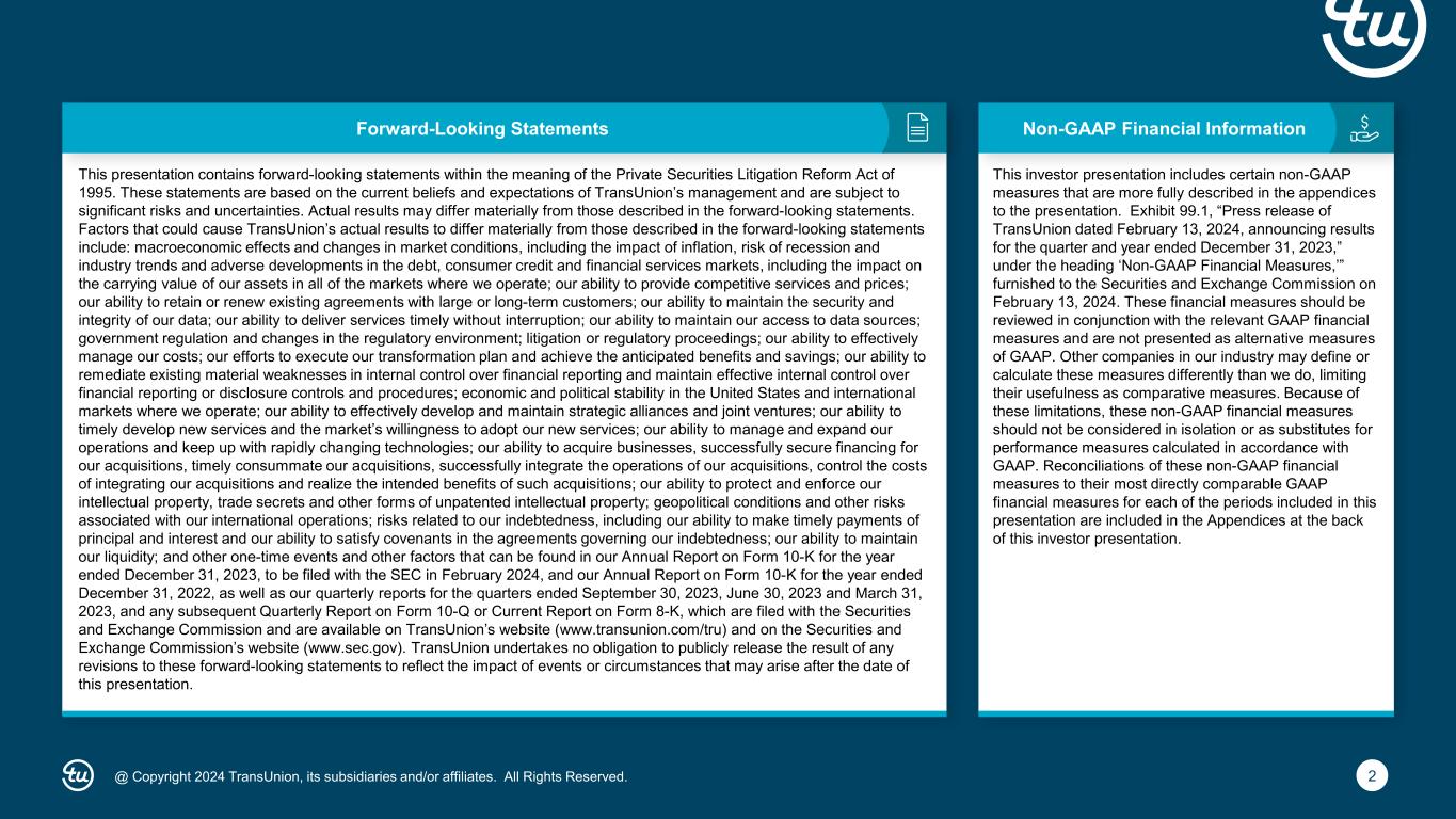 2@ Copyright 2024 TransUnion, its subsidiaries and/or affiliates. All Rights Reserved. Non-GAAP Financial InformationForward-Looking Statements This presentation contains forward-looking statements within the meaning of the Private Securities Litigation Reform Act of 1995. These statements are based on the current beliefs and expectations of TransUnion’s management and are subject to significant risks and uncertainties. Actual results may differ materially from those described in the forward-looking statements. Factors that could cause TransUnion’s actual results to differ materially from those described in the forward-looking statements include: macroeconomic effects and changes in market conditions, including the impact of inflation, risk of recession and industry trends and adverse developments in the debt, consumer credit and financial services markets, including the impact on the carrying value of our assets in all of the markets where we operate; our ability to provide competitive services and prices; our ability to retain or renew existing agreements with large or long-term customers; our ability to maintain the security and integrity of our data; our ability to deliver services timely without interruption; our ability to maintain our access to data sources; government regulation and changes in the regulatory environment; litigation or regulatory proceedings; our ability to effectively manage our costs; our efforts to execute our transformation plan and achieve the anticipated benefits and savings; our ability to remediate existing material weaknesses in internal control over financial reporting and maintain effective internal control over financial reporting or disclosure controls and procedures; economic and political stability in the United States and international markets where we operate; our ability to effectively develop and maintain strategic alliances and joint ventures; our ability to timely develop new services and the market’s willingness to adopt our new services; our ability to manage and expand our operations and keep up with rapidly changing technologies; our ability to acquire businesses, successfully secure financing for our acquisitions, timely consummate our acquisitions, successfully integrate the operations of our acquisitions, control the costs of integrating our acquisitions and realize the intended benefits of such acquisitions; our ability to protect and enforce our intellectual property, trade secrets and other forms of unpatented intellectual property; geopolitical conditions and other risks associated with our international operations; risks related to our indebtedness, including our ability to make timely payments of principal and interest and our ability to satisfy covenants in the agreements governing our indebtedness; our ability to maintain our liquidity; and other one-time events and other factors that can be found in our Annual Report on Form 10-K for the year ended December 31, 2023, to be filed with the SEC in February 2024, and our Annual Report on Form 10-K for the year ended December 31, 2022, as well as our quarterly reports for the quarters ended September 30, 2023, June 30, 2023 and March 31, 2023, and any subsequent Quarterly Report on Form 10-Q or Current Report on Form 8-K, which are filed with the Securities and Exchange Commission and are available on TransUnion’s website (www.transunion.com/tru) and on the Securities and Exchange Commission’s website (www.sec.gov). TransUnion undertakes no obligation to publicly release the result of any revisions to these forward-looking statements to reflect the impact of events or circumstances that may arise after the date of this presentation. This investor presentation includes certain non-GAAP measures that are more fully described in the appendices to the presentation. Exhibit 99.1, “Press release of TransUnion dated February 13, 2024, announcing results for the quarter and year ended December 31, 2023,” under the heading ‘Non-GAAP Financial Measures,’” furnished to the Securities and Exchange Commission on February 13, 2024. These financial measures should be reviewed in conjunction with the relevant GAAP financial measures and are not presented as alternative measures of GAAP. Other companies in our industry may define or calculate these measures differently than we do, limiting their usefulness as comparative measures. Because of these limitations, these non-GAAP financial measures should not be considered in isolation or as substitutes for performance measures calculated in accordance with GAAP. Reconciliations of these non-GAAP financial measures to their most directly comparable GAAP financial measures for each of the periods included in this presentation are included in the Appendices at the back of this investor presentation.