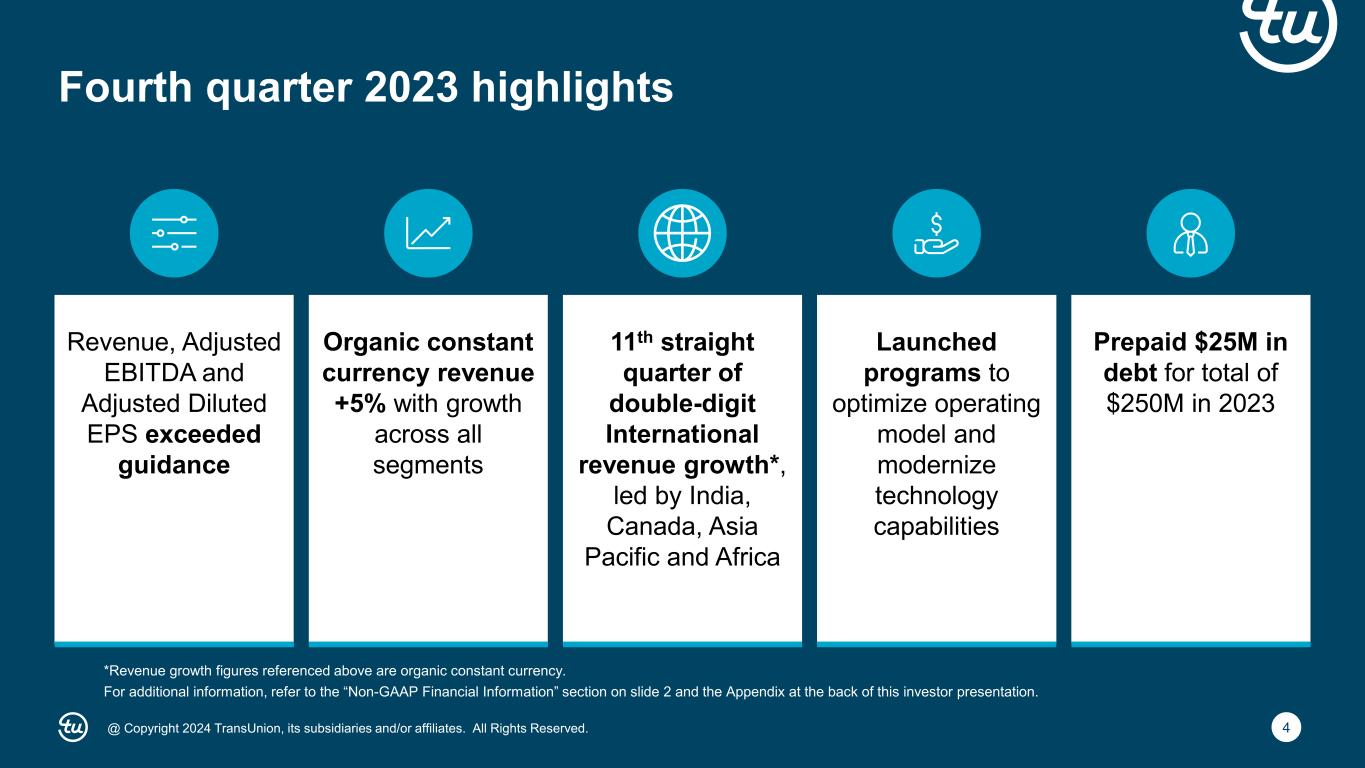 3@ Copyright 2024 TransUnion, its subsidiaries and/or affiliates. All Rights Reserved. Fourth quarter 2023 highlights 2024 strategic priorities Fourth quarter 2023 financial results 1 2 3 First quarter and full-year 2024 guidance 4