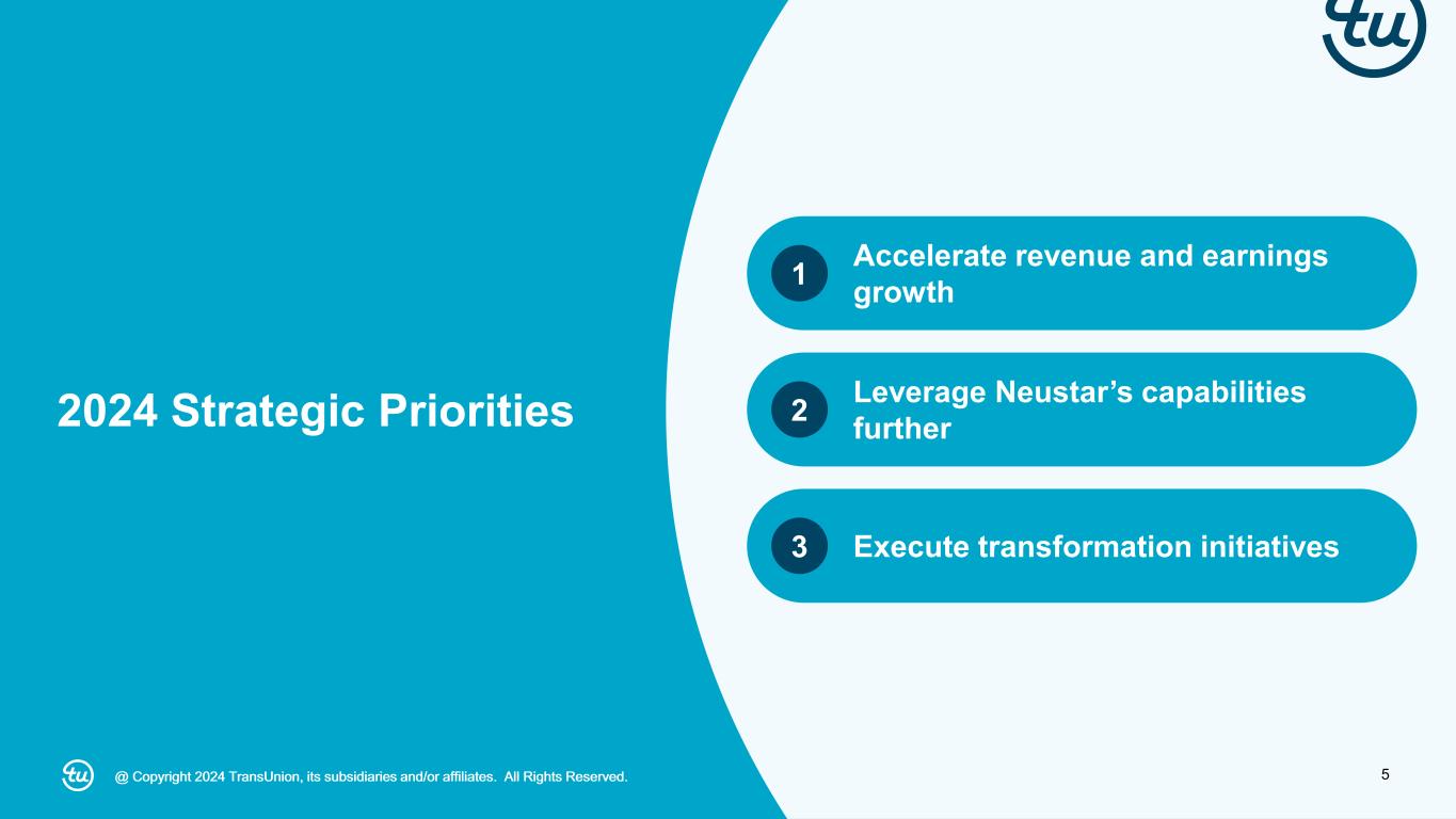 4@ Copyright 2024 TransUnion, its subsidiaries and/or affiliates. All Rights Reserved. *Revenue growth figures referenced above are organic constant currency. Fourth quarter 2023 highlights Revenue, Adjusted EBITDA and Adjusted Diluted EPS exceeded guidance Organic constant currency revenue +5% with growth across all segments 11th straight quarter of double-digit International revenue growth*, led by India, Canada, Asia Pacific and Africa Launched programs to optimize operating model and modernize technology capabilities Prepaid $25M in debt for total of $250M in 2023 For additional information, refer to the “Non-GAAP Financial Information” section on slide 2 and the Appendix at the back of this investor presentation.