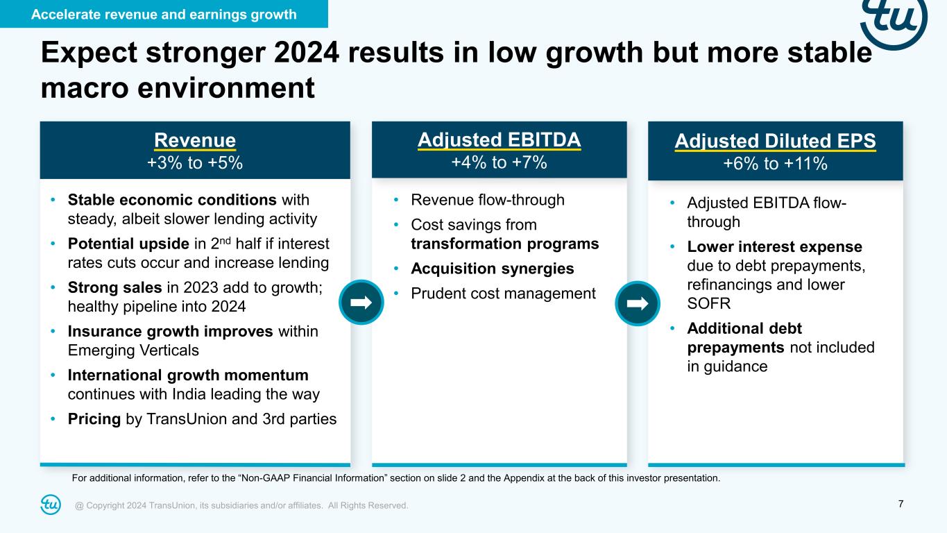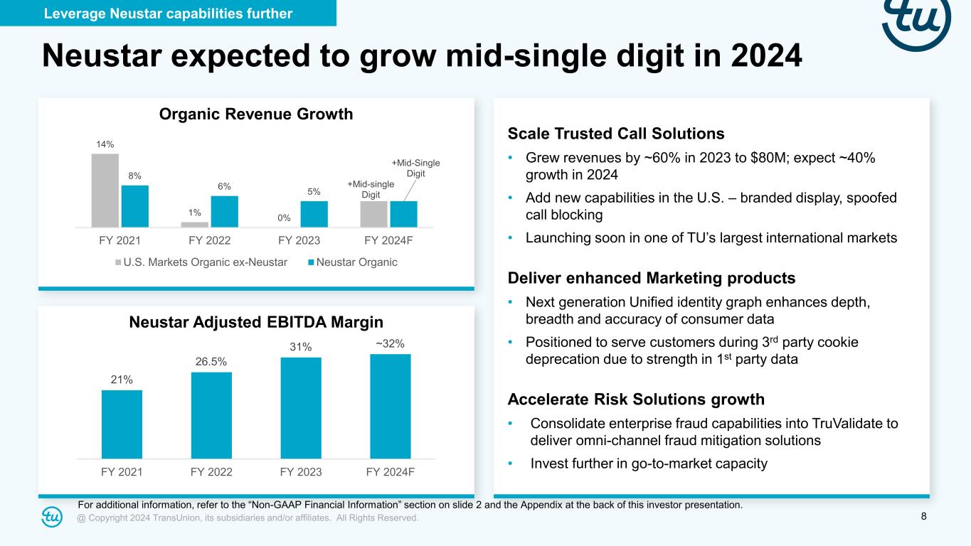 @ Copyright 2024 TransUnion, its subsidiaries and/or affiliates. All Rights Reserved. 7 Revenue +3% to +5% Expect stronger 2024 results in low growth but more stable macro environment • Stable economic conditions with steady, albeit slower lending activity • Potential upside in 2nd half if interest rates cuts occur and increase lending • Strong sales in 2023 add to growth; healthy pipeline into 2024 • Insurance growth improves within Emerging Verticals • International growth momentum continues with India leading the way • Pricing by TransUnion and 3rd parties • Revenue flow-through • Cost savings from transformation programs • Acquisition synergies • Prudent cost management • Adjusted EBITDA flow- through • Lower interest expense due to debt prepayments, refinancings and lower SOFR • Additional debt prepayments not included in guidance Accelerate revenue and earnings growth For additional information, refer to the “Non-GAAP Financial Information” section on slide 2 and the Appendix at the back of this investor presentation. Adjusted EBITDA +4% to +7% Adjusted Diluted EPS +6% to +11%