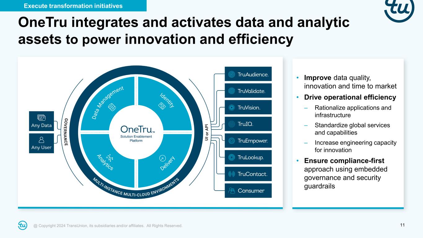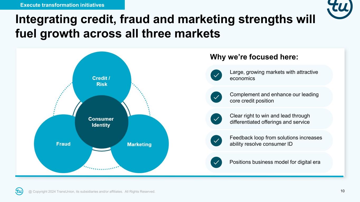 @ Copyright 2024 TransUnion, its subsidiaries and/or affiliates. All Rights Reserved. 10 Integrating credit, fraud and marketing strengths will fuel growth across all three markets Execute transformation initiatives Why we’re focused here: Feedback loop from solutions increases ability resolve consumer ID Large, growing markets with attractive economics Clear right to win and lead through differentiated offerings and service Complement and enhance our leading core credit position Positions business model for digital era