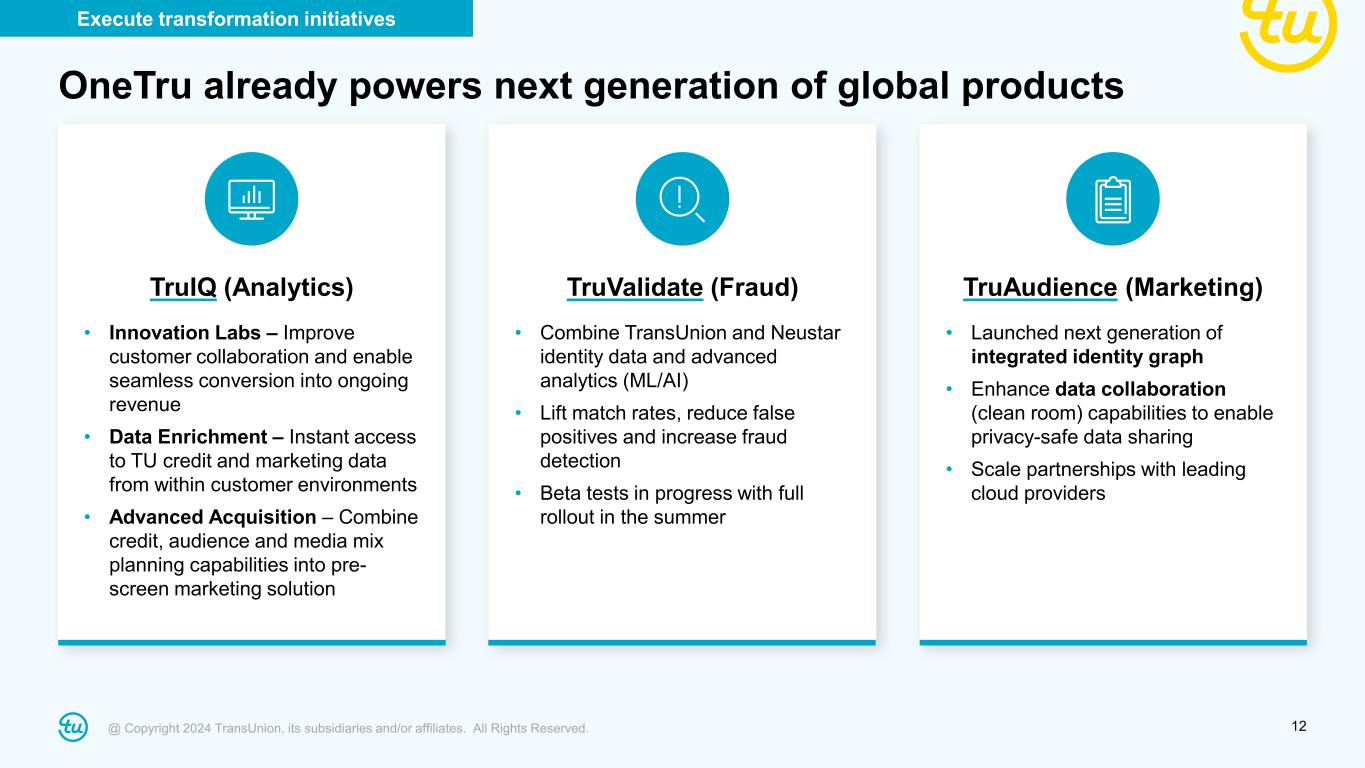 @ Copyright 2024 TransUnion, its subsidiaries and/or affiliates. All Rights Reserved. 11 OneTru integrates and activates data and analytic assets to power innovation and efficiency • Improve data quality, innovation and time to market • Drive operational efficiency – Rationalize applications and infrastructure – Standardize global services and capabilities – Increase engineering capacity for innovation • Ensure compliance-first approach using embedded governance and security guardrails Execute transformation initiatives