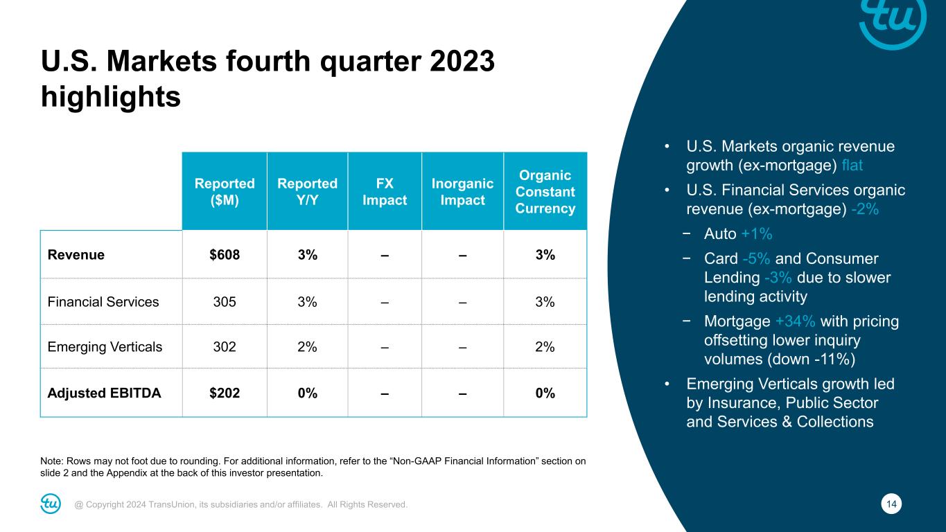 13@ Copyright 2024 TransUnion, its subsidiaries and/or affiliates. All Rights Reserved. Consolidated fourth quarter 2023 highlights For additional information, refer to the “Non-GAAP Financial Information” section on slide 2 and the Appendix at the back of this investor presentation. Reported ($M) Y/Y Change Revenue $954 6% Organic Constant Currency Revenue 5% Adjusted EBITDA $326 1% Adjusted EBITDA Margin 34.2% (140)bps Adjusted Diluted EPS $0.80 2% • Organic constant currency revenue growth of +5%, or +4% excluding mortgage