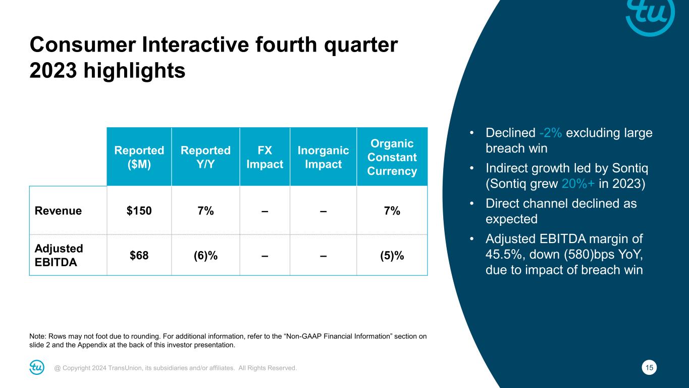 14@ Copyright 2024 TransUnion, its subsidiaries and/or affiliates. All Rights Reserved. U.S. Markets fourth quarter 2023 highlights Note: Rows may not foot due to rounding. For additional information, refer to the “Non-GAAP Financial Information” section on slide 2 and the Appendix at the back of this investor presentation. • U.S. Markets organic revenue growth (ex-mortgage) flat • U.S. Financial Services organic revenue (ex-mortgage) -2% − Auto +1% − Card -5% and Consumer Lending -3% due to slower lending activity − Mortgage +34% with pricing offsetting lower inquiry volumes (down -11%) • Emerging Verticals growth led by Insurance, Public Sector and Services & Collections Reported ($M) Reported Y/Y FX Impact Inorganic Impact Organic Constant Currency Revenue $608 3% – – 3% Financial Services 305 3% – – 3% Emerging Verticals 302 2% – – 2% Adjusted EBITDA $202 0% – – 0%