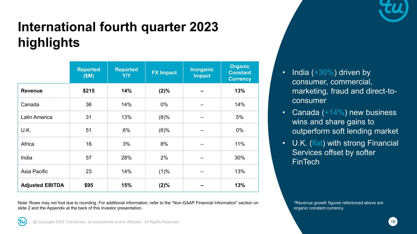 15@ Copyright 2024 TransUnion, its subsidiaries and/or affiliates. All Rights Reserved. Consumer Interactive fourth quarter 2023 highlights Note: Rows may not foot due to rounding. For additional information, refer to the “Non-GAAP Financial Information” section on slide 2 and the Appendix at the back of this investor presentation. • Declined -2% excluding large breach win • Indirect growth led by Sontiq (Sontiq grew 20%+ in 2023) • Direct channel declined as expected • Adjusted EBITDA margin of 45.5%, down (580)bps YoY, due to impact of breach win Reported ($M) Reported Y/Y FX Impact Inorganic Impact Organic Constant Currency Revenue $150 7% – – 7% Adjusted EBITDA $68 (6)% – – (5)%