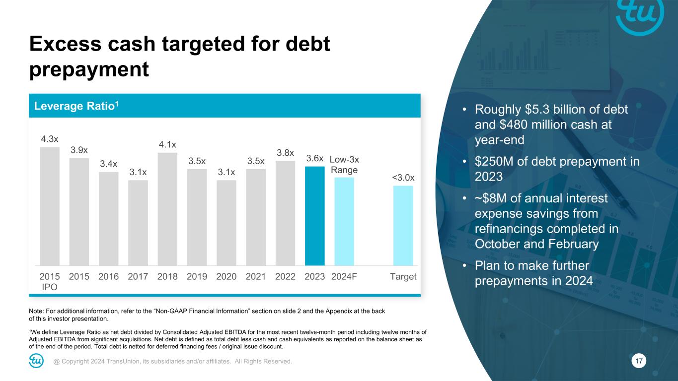 16@ Copyright 2024 TransUnion, its subsidiaries and/or affiliates. All Rights Reserved. International fourth quarter 2023 highlights Note: Rows may not foot due to rounding. For additional information, refer to the “Non-GAAP Financial Information” section on slide 2 and the Appendix at the back of this investor presentation. • India (+30%) driven by consumer, commercial, marketing, fraud and direct-to- consumer • Canada (+14%) new business wins and share gains to outperform soft lending market • U.K. (flat) with strong Financial Services offset by softer FinTech Reported ($M) Reported Y/Y FX Impact Inorganic Impact Organic Constant Currency Revenue $215 14% (2)% – 13% Canada 36 14% 0% – 14% Latin America 31 13% (8)% – 5% U.K. 51 6% (6)% – 0% Africa 16 3% 8% – 11% India 57 28% 2% – 30% Asia Pacific 23 14% (1)% – 13% Adjusted EBITDA $95 15% (2)% – 13% *Revenue growth figures referenced above are organic constant currency.