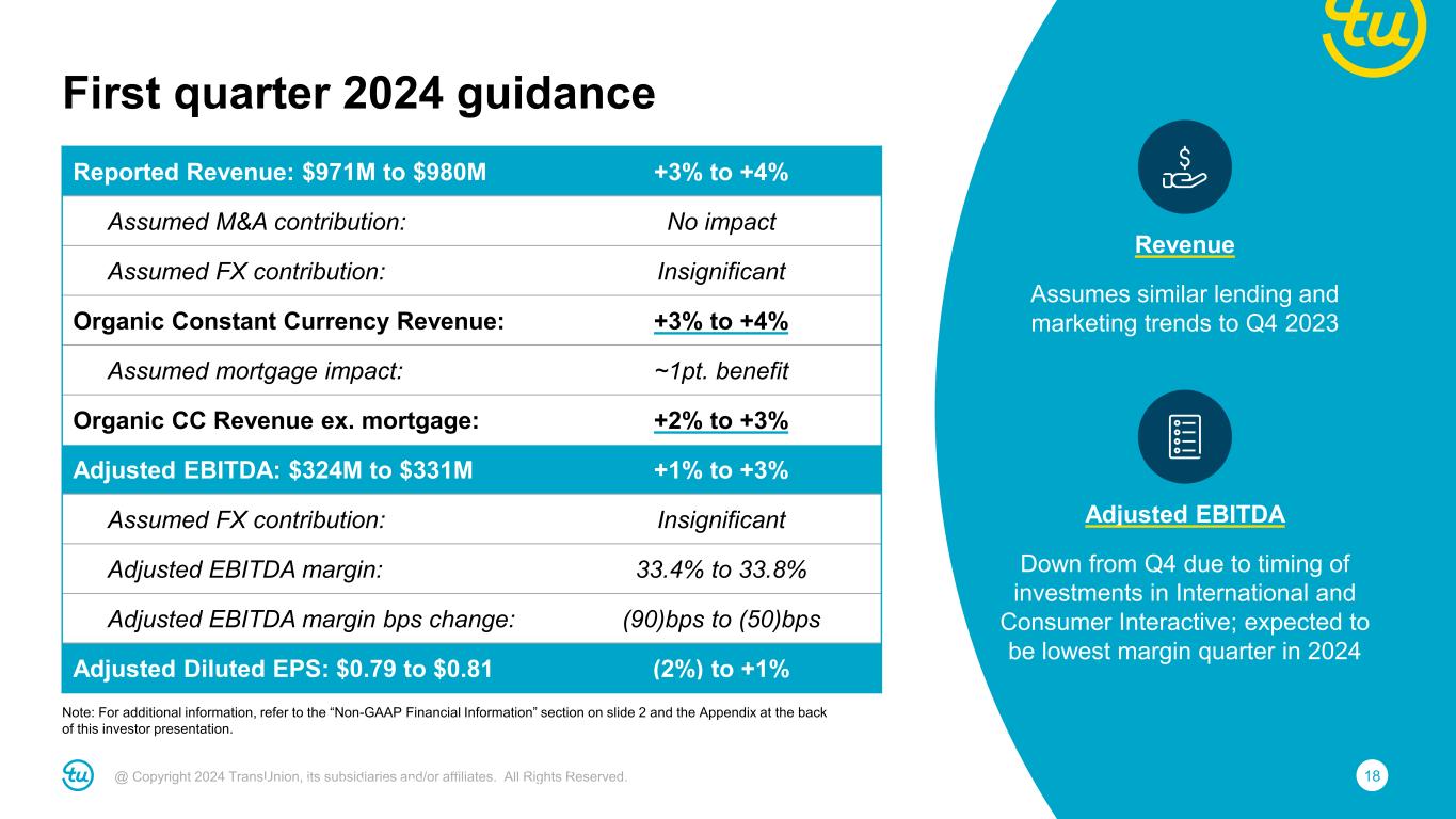 17@ Copyright 2024 TransUnion, its subsidiaries and/or affiliates. All Rights Reserved. • Roughly $5.3 billion of debt and $480 million cash at year-end • $250M of debt prepayment in 2023 • ~$8M of annual interest expense savings from refinancings completed in October and February • Plan to make further prepayments in 2024 1We define Leverage Ratio as net debt divided by Consolidated Adjusted EBITDA for the most recent twelve-month period including twelve months of Adjusted EBITDA from significant acquisitions. Net debt is defined as total debt less cash and cash equivalents as reported on the balance sheet as of the end of the period. Total debt is netted for deferred financing fees / original issue discount.​ Note: For additional information, refer to the “Non-GAAP Financial Information” section on slide 2 and the Appendix at the back of this investor presentation. Excess cash targeted for debt prepayment Leverage Ratio1 4.3x 3.9x 3.4x 3.1x 4.1x 3.5x 3.1x 3.5x 3.8x 3.6x Low-3x Range <3.0x 2015 IPO 2015 2016 2017 2018 2019 2020 2021 2022 2023 2024F Target