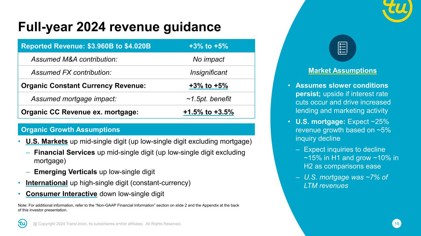 18@ Copyright 2024 TransUnion, its subsidiaries and/or affiliates. All Rights Reserved. Reported Revenue: $971M to $980M +3% to +4% Assumed M&A contribution: No impact Assumed FX contribution: Insignificant Organic Constant Currency Revenue: +3% to +4% Assumed mortgage impact: ~1pt. benefit Organic CC Revenue ex. mortgage: +2% to +3% Adjusted EBITDA: $324M to $331M +1% to +3% Assumed FX contribution: Insignificant Adjusted EBITDA margin: 33.4% to 33.8% Adjusted EBITDA margin bps change: (90)bps to (50)bps Adjusted Diluted EPS: $0.79 to $0.81 (2%) to +1% Note: For additional information, refer to the “Non-GAAP Financial Information” section on slide 2 and the Appendix at the back of this investor presentation. Revenue First quarter 2024 guidance Assumes similar lending and marketing trends to Q4 2023 Adjusted EBITDA Down from Q4 due to timing of investments in International and Consumer Interactive; expected to be lowest margin quarter in 2024 Note: For additional information, refer to the “Non-GAAP Financial Information” section on slide 2 and the Appendix at the back of this investor presentation.