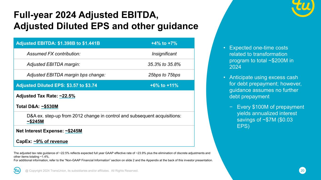 19@ Copyright 2024 TransUnion, its subsidiaries and/or affiliates. All Rights Reserved. Organic Growth Assumptions • Assumes slower conditions persist; upside if interest rate cuts occur and drive increased lending and marketing activity • U.S. mortgage: Expect ~25% revenue growth based on ~5% inquiry decline – Expect inquiries to decline ~15% in H1 and grow ~10% in H2 as comparisons ease – U.S. mortgage was ~7% of LTM revenues Note: For additional information, refer to the “Non-GAAP Financial Information” section on slide 2 and the Appendix at the back of this investor presentation. Full-year 2024 revenue guidance Reported Revenue: $3.960B to $4.020B +3% to +5% Assumed M&A contribution: No impact Assumed FX contribution: Insignificant Organic Constant Currency Revenue: +3% to +5% Assumed mortgage impact: ~1.5pt. benefit Organic CC Revenue ex. mortgage: +1.5% to +3.5% Market Assumptions • U.S. Markets up mid-single digit (up low-single digit excluding mortgage) – Financial Services up mid-single digit (up low-single digit excluding mortgage) – Emerging Verticals up low-single digit • International up high-single digit (constant-currency) • Consumer Interactive down low-single digit Note: For additional information, refer to the “Non-GAAP Financial Information” section on slide 2 and the Appendix at the back of this investor presentation.