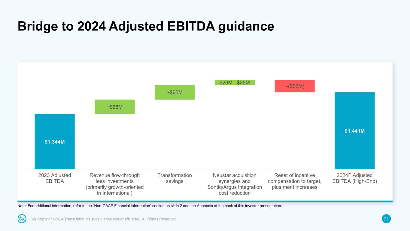20@ Copyright 2024 TransUnion, its subsidiaries and/or affiliates. All Rights Reserved. • Expected one-time costs related to transformation program to total ~$200M in 2024 • Anticipate using excess cash for debt prepayment; however, guidance assumes no further debt prepayment − Every $100M of prepayment yields annualized interest savings of ~$7M ($0.03 EPS) The adjusted tax rate guidance of ~22.5% reflects expected full year GAAP effective rate of ~23.9% plus the elimination of discrete adjustments and other items totaling ~1.4%. For additional information, refer to the “Non-GAAP Financial Information” section on slide 2 and the Appendix at the back of this investor presentation. Full-year 2024 Adjusted EBITDA, Adjusted Diluted EPS and other guidance Adjusted EBITDA: $1.398B to $1.441B +4% to +7% Assumed FX contribution: Insignificant Adjusted EBITDA margin: 35.3% to 35.8% Adjusted EBITDA margin bps change: 25bps to 75bps Adjusted Diluted EPS: $3.57 to $3.74 +6% to +11% Adjusted Tax Rate: ~22.5% Total D&A: ~$530M D&A ex. step-up from 2012 change in control and subsequent acquisitions: ~$245M Net Interest Expense: ~$245M CapEx: ~9% of revenue