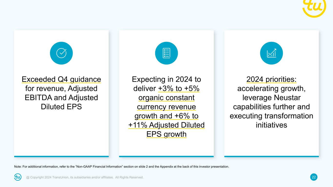 21@ Copyright 2024 TransUnion, its subsidiaries and/or affiliates. All Rights Reserved. Bridge to 2024 Adjusted EBITDA guidance $1,344M $1,441M ~$65M ~$65M $20M - $25M ~($55M) 2023 Adjusted EBITDA Revenue flow-through less investments (primarily growth-oriented in International) Transformation savings Neustar acquisition synergies and Sontiq/Argus integration cost reduction Reset of incentive compensation to target, plus merit increases 2024F Adjusted EBITDA (High-End) Note: For additional information, refer to the “Non-GAAP Financial Information” section on slide 2 and the Appendix at the back of this investor presentation.