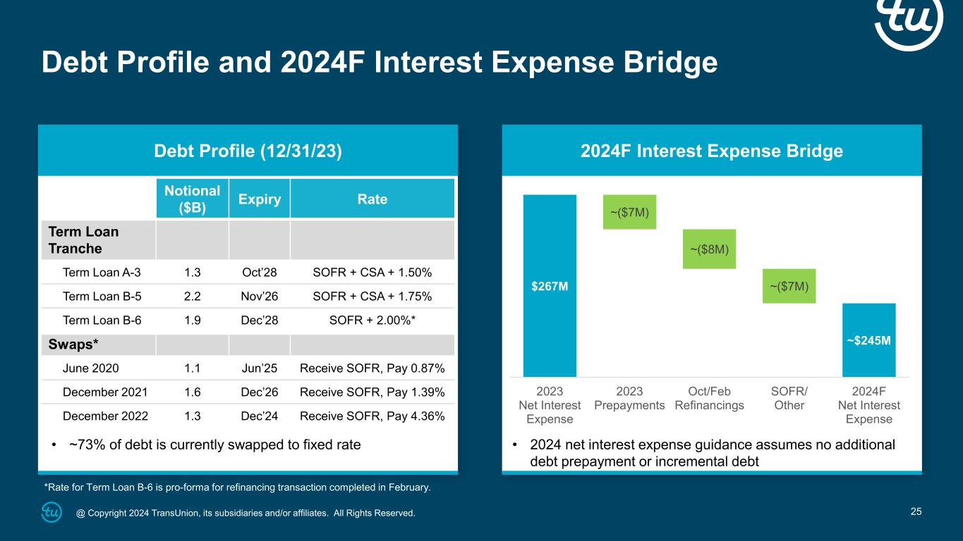 @ Copyright 2024 TransUnion, its subsidiaries and/or affiliates. All Rights Reserved. 25 Debt Profile and 2024F Interest Expense Bridge Debt Profile (12/31/23) 2024F Interest Expense Bridge Notional ($B) Expiry Rate Term Loan Tranche Term Loan A-3 1.3 Oct’28 SOFR + CSA + 1.50% Term Loan B-5 2.2 Nov’26 SOFR + CSA + 1.75% Term Loan B-6 1.9 Dec’28 SOFR + 2.00%* Swaps* June 2020 1.1 Jun’25 Receive SOFR, Pay 0.87% December 2021 1.6 Dec’26 Receive SOFR, Pay 1.39% December 2022 1.3 Dec’24 Receive SOFR, Pay 4.36% • ~73% of debt is currently swapped to fixed rate • 2024 net interest expense guidance assumes no additional debt prepayment or incremental debt $267M ~$245M ~($7M) ~($8M) ~($7M) 2023 Net Interest Expense 2023 Prepayments Oct/Feb Refinancings SOFR/ Other 2024F Net Interest Expense *Rate for Term Loan B-6 is pro-forma for refinancing transaction completed in February.