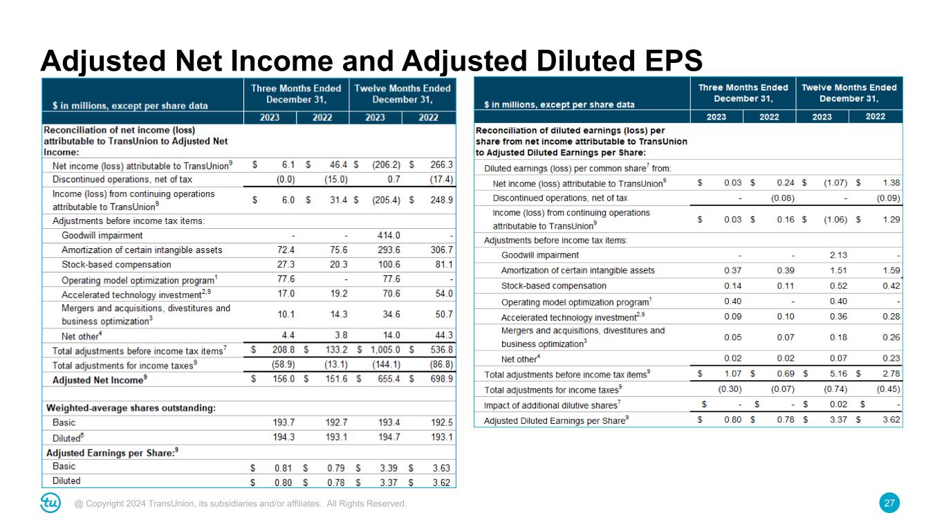 27@ Copyright 2024 TransUnion, its subsidiaries and/or affiliates. All Rights Reserved. Adjusted Net Income and Adjusted Diluted EPS