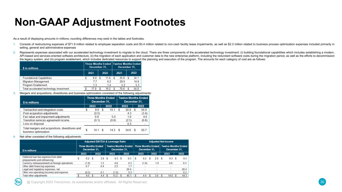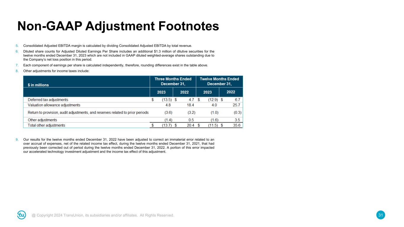 30@ Copyright 2024 TransUnion, its subsidiaries and/or affiliates. All Rights Reserved. Non-GAAP Adjustment Footnotes As a result of displaying amounts in millions, rounding differences may exist in the tables and footnotes. 1. Consists of restructuring expenses of $71.9 million related to employee separation costs and $3.4 million related to non-cash facility lease impairments, as well as $2.3 million related to business process optimization expenses included primarily in selling, general and administrative expenses 2. Represents expenses associated with our accelerated technology investment to migrate to the cloud. There are three components of the accelerated technology investment: (i) building foundational capabilities which includes establishing a modern, API-based and services-oriented software architecture, (ii) the migration of each application and customer data to the new enterprise platform, including the redundant software costs during the migration period, as well as the efforts to decommission the legacy system, and (iii) program enablement, which includes dedicated resources to support the planning and execution of the program. The amounts for each category of cost are as follows: 3. Mergers and acquisitions, divestitures and business optimization consisted of the following adjustments: 4. Net other consisted of the following adjustments: