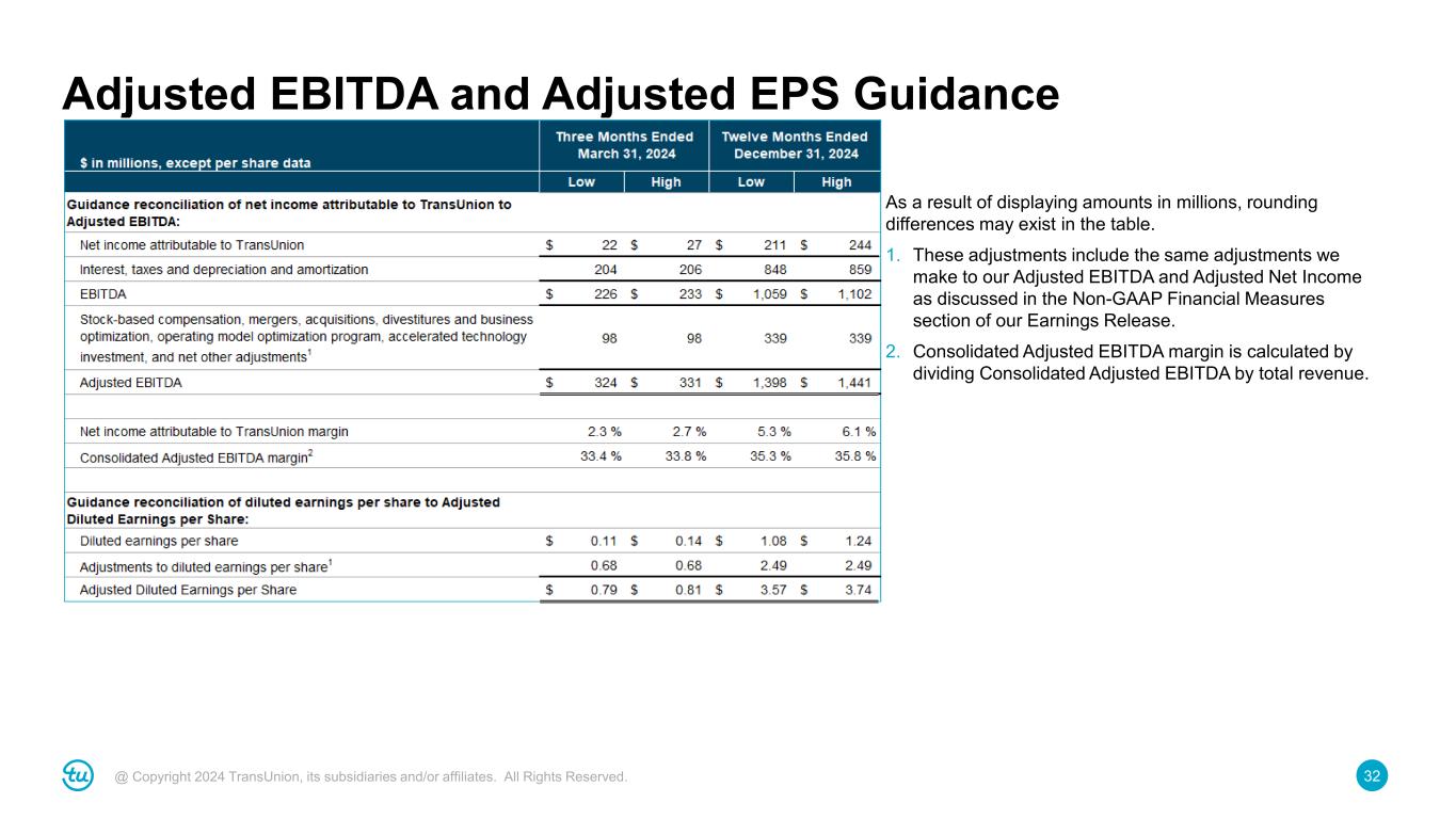 31@ Copyright 2024 TransUnion, its subsidiaries and/or affiliates. All Rights Reserved. Non-GAAP Adjustment Footnotes 5. Consolidated Adjusted EBITDA margin is calculated by dividing Consolidated Adjusted EBITDA by total revenue. 6. Diluted share counts for Adjusted Diluted Earnings Per Share includes an additional $1.3 million of dilutive securities for the twelve months ended December 31, 2023 which are not included in GAAP diluted weighted-average shares outstanding due to the Company’s net loss position in this period. 7. Each component of earnings per share is calculated independently, therefore, rounding differences exist in the table above. 8. Other adjustments for income taxes include: 9. Our results for the twelve months ended December 31, 2022 have been adjusted to correct an immaterial error related to an over accrual of expenses, net of the related income tax effect, during the twelve months ended December 31, 2021, that had previously been corrected out of period during the twelve months ended December 31, 2022. A portion of this error impacted our accelerated technology investment adjustment and the income tax effect of this adjustment.