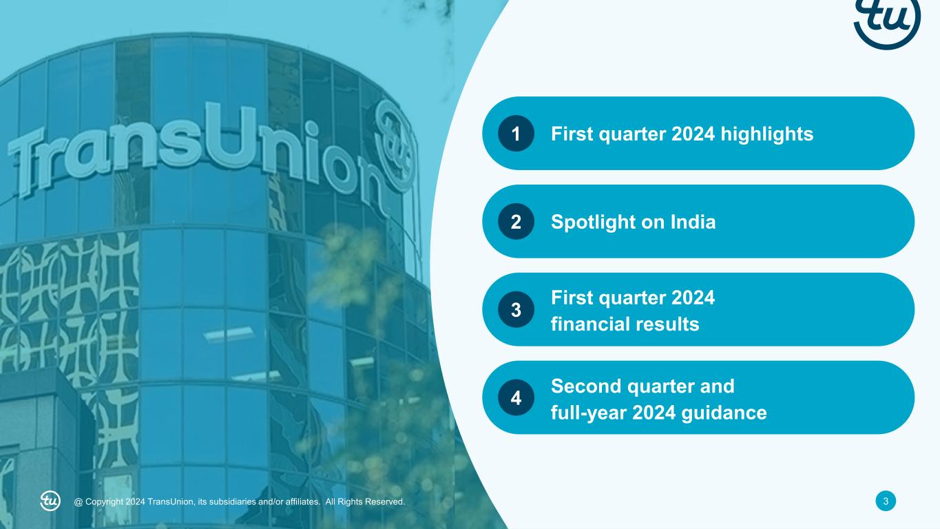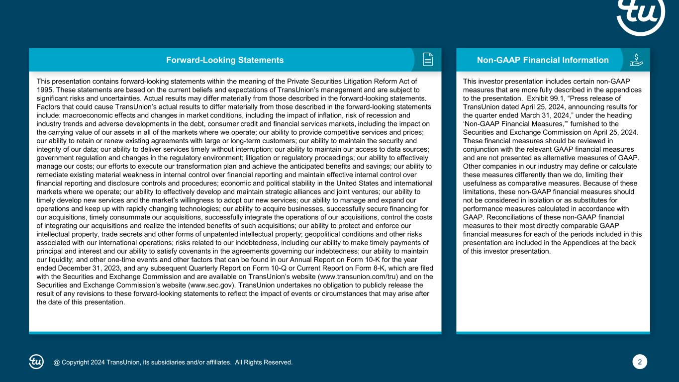 2@ Copyright 2024 TransUnion, its subsidiaries and/or affiliates. All Rights Reserved. Non-GAAP Financial InformationForward-Looking Statements This presentation contains forward-looking statements within the meaning of the Private Securities Litigation Reform Act of 1995. These statements are based on the current beliefs and expectations of TransUnion’s management and are subject to significant risks and uncertainties. Actual results may differ materially from those described in the forward-looking statements. Factors that could cause TransUnion’s actual results to differ materially from those described in the forward-looking statements include: macroeconomic effects and changes in market conditions, including the impact of inflation, risk of recession and industry trends and adverse developments in the debt, consumer credit and financial services markets, including the impact on the carrying value of our assets in all of the markets where we operate; our ability to provide competitive services and prices; our ability to retain or renew existing agreements with large or long-term customers; our ability to maintain the security and integrity of our data; our ability to deliver services timely without interruption; our ability to maintain our access to data sources; government regulation and changes in the regulatory environment; litigation or regulatory proceedings; our ability to effectively manage our costs; our efforts to execute our transformation plan and achieve the anticipated benefits and savings; our ability to remediate existing material weakness in internal control over financial reporting and maintain effective internal control over financial reporting and disclosure controls and procedures; economic and political stability in the United States and international markets where we operate; our ability to effectively develop and maintain strategic alliances and joint ventures; our ability to timely develop new services and the market’s willingness to adopt our new services; our ability to manage and expand our operations and keep up with rapidly changing technologies; our ability to acquire businesses, successfully secure financing for our acquisitions, timely consummate our acquisitions, successfully integrate the operations of our acquisitions, control the costs of integrating our acquisitions and realize the intended benefits of such acquisitions; our ability to protect and enforce our intellectual property, trade secrets and other forms of unpatented intellectual property; geopolitical conditions and other risks associated with our international operations; risks related to our indebtedness, including our ability to make timely payments of principal and interest and our ability to satisfy covenants in the agreements governing our indebtedness; our ability to maintain our liquidity; and other one-time events and other factors that can be found in our Annual Report on Form 10-K for the year ended December 31, 2023, and any subsequent Quarterly Report on Form 10-Q or Current Report on Form 8-K, which are filed with the Securities and Exchange Commission and are available on TransUnion’s website (www.transunion.com/tru) and on the Securities and Exchange Commission’s website (www.sec.gov). TransUnion undertakes no obligation to publicly release the result of any revisions to these forward-looking statements to reflect the impact of events or circumstances that may arise after the date of this presentation. This investor presentation includes certain non-GAAP measures that are more fully described in the appendices to the presentation. Exhibit 99.1, “Press release of TransUnion dated April 25, 2024, announcing results for the quarter ended March 31, 2024,” under the heading ‘Non-GAAP Financial Measures,’” furnished to the Securities and Exchange Commission on April 25, 2024. These financial measures should be reviewed in conjunction with the relevant GAAP financial measures and are not presented as alternative measures of GAAP. Other companies in our industry may define or calculate these measures differently than we do, limiting their usefulness as comparative measures. Because of these limitations, these non-GAAP financial measures should not be considered in isolation or as substitutes for performance measures calculated in accordance with GAAP. Reconciliations of these non-GAAP financial measures to their most directly comparable GAAP financial measures for each of the periods included in this presentation are included in the Appendices at the back of this investor presentation.