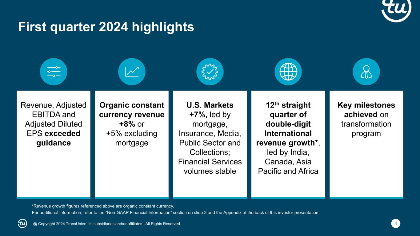 3@ Copyright 2024 TransUnion, its subsidiaries and/or affiliates. All Rights Reserved. First quarter 2024 highlights Spotlight on India First quarter 2024 financial results 1 2 3 Second quarter and full-year 2024 guidance 4
