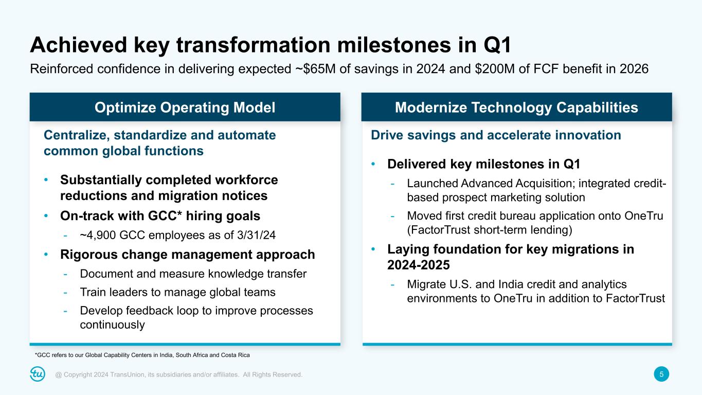 4@ Copyright 2024 TransUnion, its subsidiaries and/or affiliates. All Rights Reserved. *Revenue growth figures referenced above are organic constant currency. First quarter 2024 highlights Revenue, Adjusted EBITDA and Adjusted Diluted EPS exceeded guidance Organic constant currency revenue +8% or +5% excluding mortgage U.S. Markets +7%, led by mortgage, Insurance, Media, Public Sector and Collections; Financial Services volumes stable 12th straight quarter of double-digit International revenue growth*, led by India, Canada, Asia Pacific and Africa Key milestones achieved on transformation program For additional information, refer to the “Non-GAAP Financial Information” section on slide 2 and the Appendix at the back of this investor presentation.