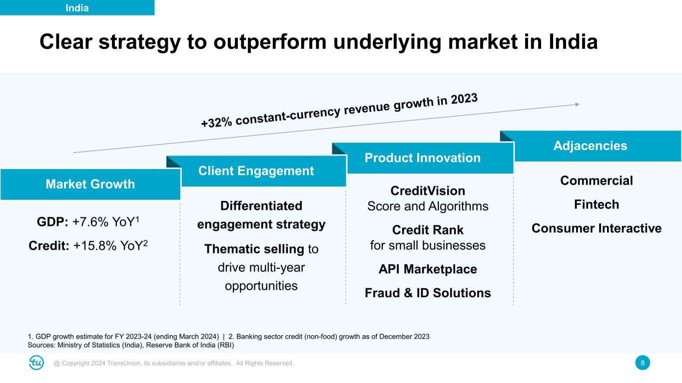 @ Copyright 2024 TransUnion, its subsidiaries and/or affiliates. All Rights Reserved. 7 #5 global GDP with highest growth rate; expected to double by 2030 Attractive demographics – 890M consumers <35 years old; aspirational middle class Modernizing economy with rapid digitization TU CIBIL – 20+ years history, synonymous with credit reports 6,000+ B2B clients across banks, non-banking financial institutions, fintechs and insurance Reaching 100M consumers via direct-to-consumer channels Playing a vital role in India's credit economy Enabling critical growth vectors including SMBs, agriculture, and microfinance Driving credit awareness and education for millions of consumers Fastest growing major economy Market-leading credit bureau Growing with India, one of the most attractive markets India Delivering lasting impact Source: IMF, S&P Global, India Ministry of Finance