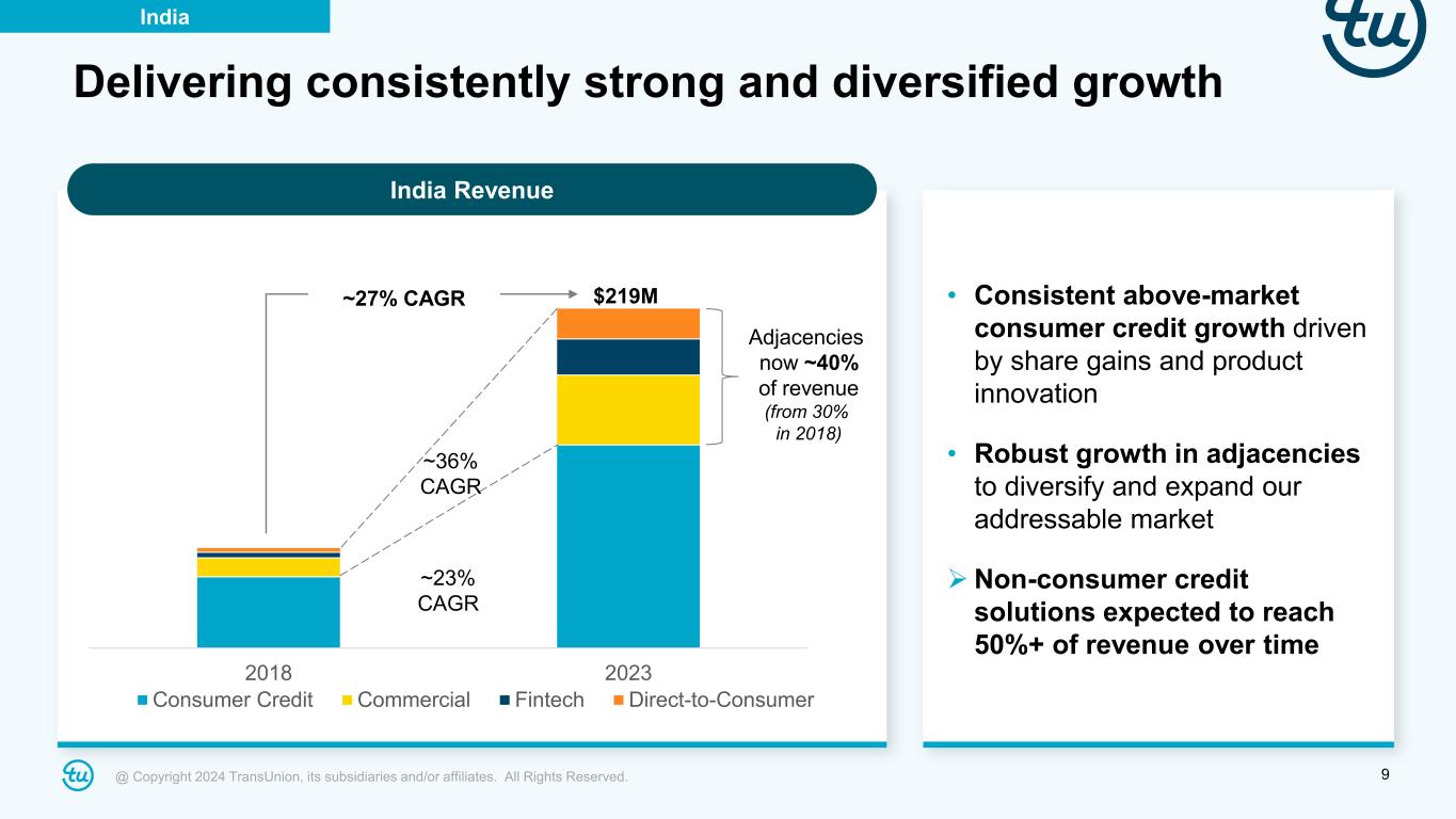 8@ Copyright 2024 TransUnion, its subsidiaries and/or affiliates. All Rights Reserved. Commercial Fintech Consumer Interactive CreditVision Score and Algorithms Credit Rank for small businesses API Marketplace Fraud & ID Solutions Differentiated engagement strategy Thematic selling to drive multi-year opportunities GDP: +7.6% YoY1 Credit: +15.8% YoY2 1. GDP growth estimate for FY 2023-24 (ending March 2024) | 2. Banking sector credit (non-food) growth as of December 2023 Sources: Ministry of Statistics (India), Reserve Bank of India (RBI) Adjacencies Product Innovation Client Engagement Market Growth Clear strategy to outperform underlying market in India India