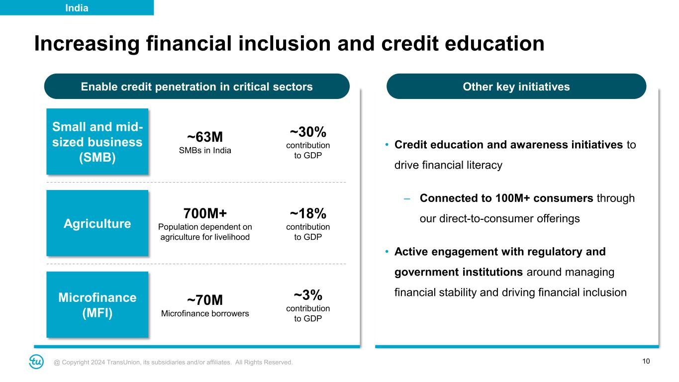 @ Copyright 2024 TransUnion, its subsidiaries and/or affiliates. All Rights Reserved. 9 Delivering consistently strong and diversified growth • Consistent above-market consumer credit growth driven by share gains and product innovation • Robust growth in adjacencies to diversify and expand our addressable market Non-consumer credit solutions expected to reach 50%+ of revenue over time India Revenue India 2018 2023 Consumer Credit Commercial Fintech Direct-to-Consumer $219M Adjacencies now ~40% of revenue (from 30% in 2018) ~27% CAGR ~36% CAGR ~23% CAGR