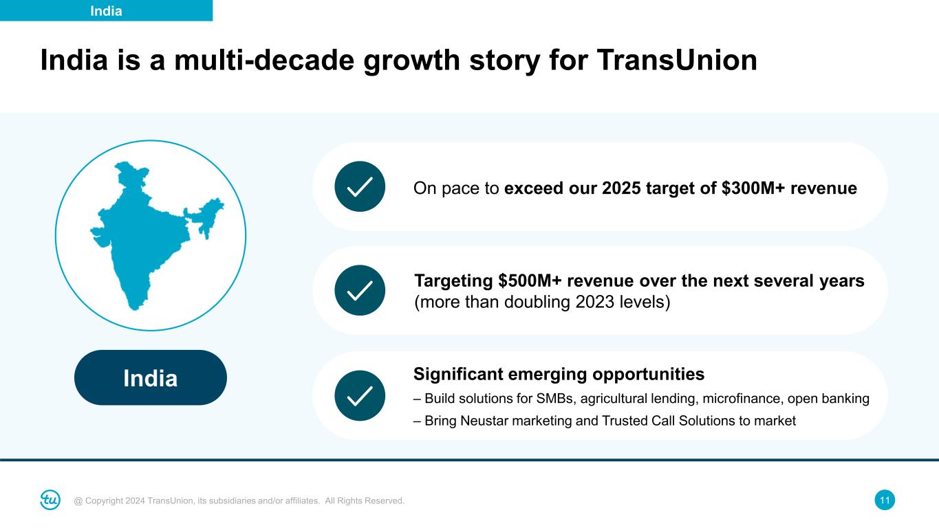 @ Copyright 2024 TransUnion, its subsidiaries and/or affiliates. All Rights Reserved. 10 Enable credit penetration in critical sectors Small and mid- sized business (SMB) Agriculture ~63M SMBs in India ~30% contribution to GDP 700M+ Population dependent on agriculture for livelihood ~18% contribution to GDP Microfinance (MFI) ~70M Microfinance borrowers ~3% contribution to GDP • Credit education and awareness initiatives to drive financial literacy – Connected to 100M+ consumers through our direct-to-consumer offerings • Active engagement with regulatory and government institutions around managing financial stability and driving financial inclusion Other key initiatives Increasing financial inclusion and credit education India