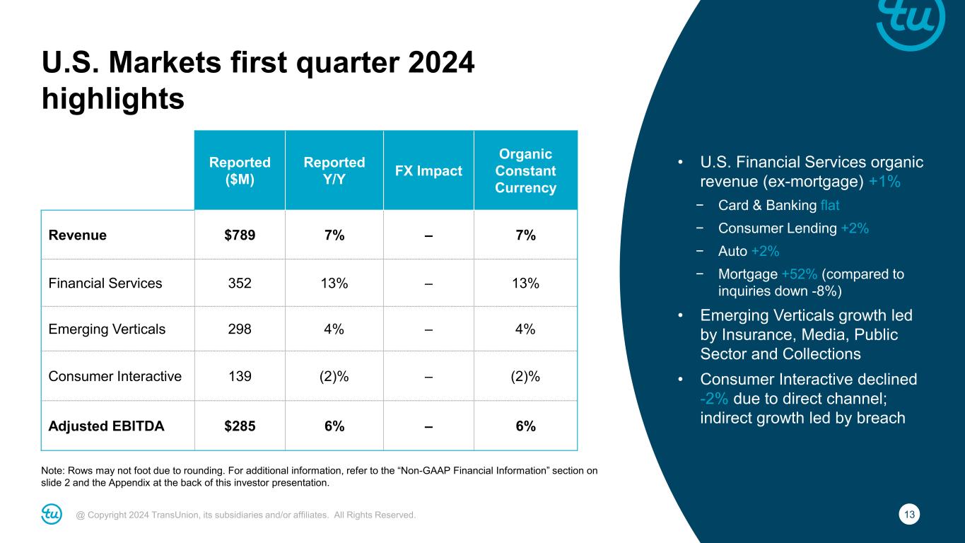 12@ Copyright 2024 TransUnion, its subsidiaries and/or affiliates. All Rights Reserved. Consolidated first quarter 2024 highlights For additional information, refer to the “Non-GAAP Financial Information” section on slide 2 and the Appendix at the back of this investor presentation. Reported ($M) Y/Y Change Revenue $1,021 9% Organic Constant Currency Revenue 8% Adjusted EBITDA $358 11% Adjusted EBITDA Margin 35.1% 80bps Adjusted Diluted EPS $0.92 14% • Organic constant currency revenue growth of +8% or +5% excluding mortgage