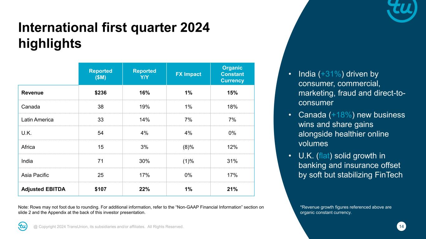 13@ Copyright 2024 TransUnion, its subsidiaries and/or affiliates. All Rights Reserved. U.S. Markets first quarter 2024 highlights Note: Rows may not foot due to rounding. For additional information, refer to the “Non-GAAP Financial Information” section on slide 2 and the Appendix at the back of this investor presentation. • U.S. Financial Services organic revenue (ex-mortgage) +1% − Card & Banking flat − Consumer Lending +2% − Auto +2% − Mortgage +52% (compared to inquiries down -8%) • Emerging Verticals growth led by Insurance, Media, Public Sector and Collections • Consumer Interactive declined -2% due to direct channel; indirect growth led by breach Reported ($M) Reported Y/Y FX Impact Organic Constant Currency Revenue $789 7% – 7% Financial Services 352 13% – 13% Emerging Verticals 298 4% – 4% Consumer Interactive 139 (2)% – (2)% Adjusted EBITDA $285 6% – 6%