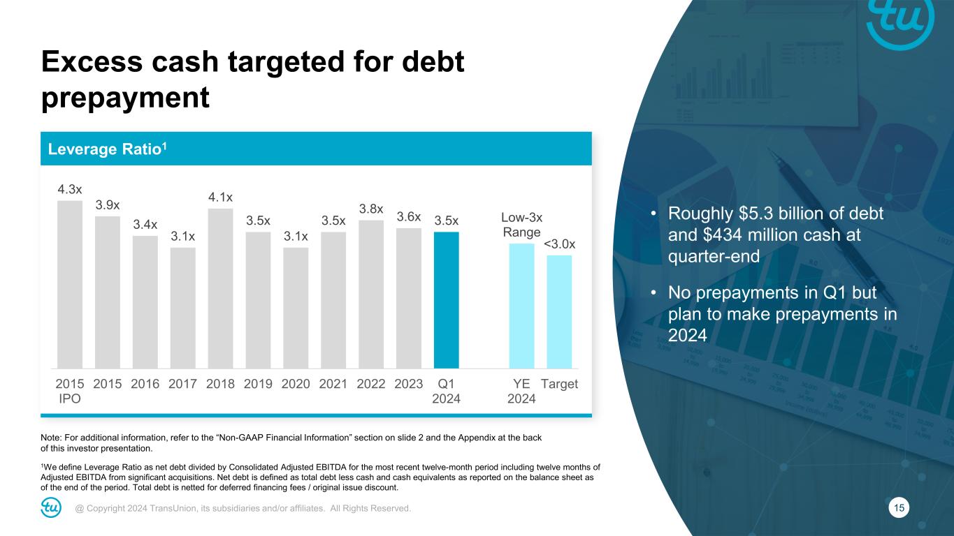 14@ Copyright 2024 TransUnion, its subsidiaries and/or affiliates. All Rights Reserved. International first quarter 2024 highlights Note: Rows may not foot due to rounding. For additional information, refer to the “Non-GAAP Financial Information” section on slide 2 and the Appendix at the back of this investor presentation. • India (+31%) driven by consumer, commercial, marketing, fraud and direct-to- consumer • Canada (+18%) new business wins and share gains alongside healthier online volumes • U.K. (flat) solid growth in banking and insurance offset by soft but stabilizing FinTech Reported ($M) Reported Y/Y FX Impact Organic Constant Currency Revenue $236 16% 1% 15% Canada 38 19% 1% 18% Latin America 33 14% 7% 7% U.K. 54 4% 4% 0% Africa 15 3% (8)% 12% India 71 30% (1)% 31% Asia Pacific 25 17% 0% 17% Adjusted EBITDA $107 22% 1% 21% *Revenue growth figures referenced above are organic constant currency.