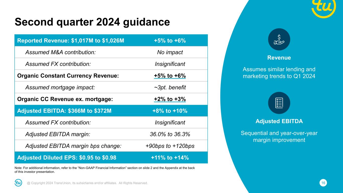 15@ Copyright 2024 TransUnion, its subsidiaries and/or affiliates. All Rights Reserved. • Roughly $5.3 billion of debt and $434 million cash at quarter-end • No prepayments in Q1 but plan to make prepayments in 2024 1We define Leverage Ratio as net debt divided by Consolidated Adjusted EBITDA for the most recent twelve-month period including twelve months of Adjusted EBITDA from significant acquisitions. Net debt is defined as total debt less cash and cash equivalents as reported on the balance sheet as of the end of the period. Total debt is netted for deferred financing fees / original issue discount.​ Note: For additional information, refer to the “Non-GAAP Financial Information” section on slide 2 and the Appendix at the back of this investor presentation. Excess cash targeted for debt prepayment Leverage Ratio1 4.3x 3.9x 3.4x 3.1x 4.1x 3.5x 3.1x 3.5x 3.8x 3.6x 3.5x Low-3x Range <3.0x 2015 IPO 2015 2016 2017 2018 2019 2020 2021 2022 2023 Q1 2024 YE 2024 Target