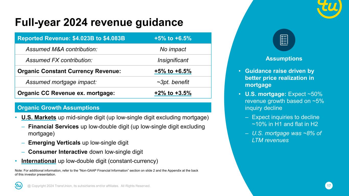 16@ Copyright 2024 TransUnion, its subsidiaries and/or affiliates. All Rights Reserved. Reported Revenue: $1,017M to $1,026M +5% to +6% Assumed M&A contribution: No impact Assumed FX contribution: Insignificant Organic Constant Currency Revenue: +5% to +6% Assumed mortgage impact: ~3pt. benefit Organic CC Revenue ex. mortgage: +2% to +3% Adjusted EBITDA: $366M to $372M +8% to +10% Assumed FX contribution: Insignificant Adjusted EBITDA margin: 36.0% to 36.3% Adjusted EBITDA margin bps change: +90bps to +120bps Adjusted Diluted EPS: $0.95 to $0.98 +11% to +14% Note: For additional information, refer to the “Non-GAAP Financial Information” section on slide 2 and the Appendix at the back of this investor presentation. Revenue Second quarter 2024 guidance Assumes similar lending and marketing trends to Q1 2024 Adjusted EBITDA Sequential and year-over-year margin improvement Note: For additional information, refer to the “Non-GAAP Financial Information” section on slide 2 and the Appendix at the back of this investor presentation.