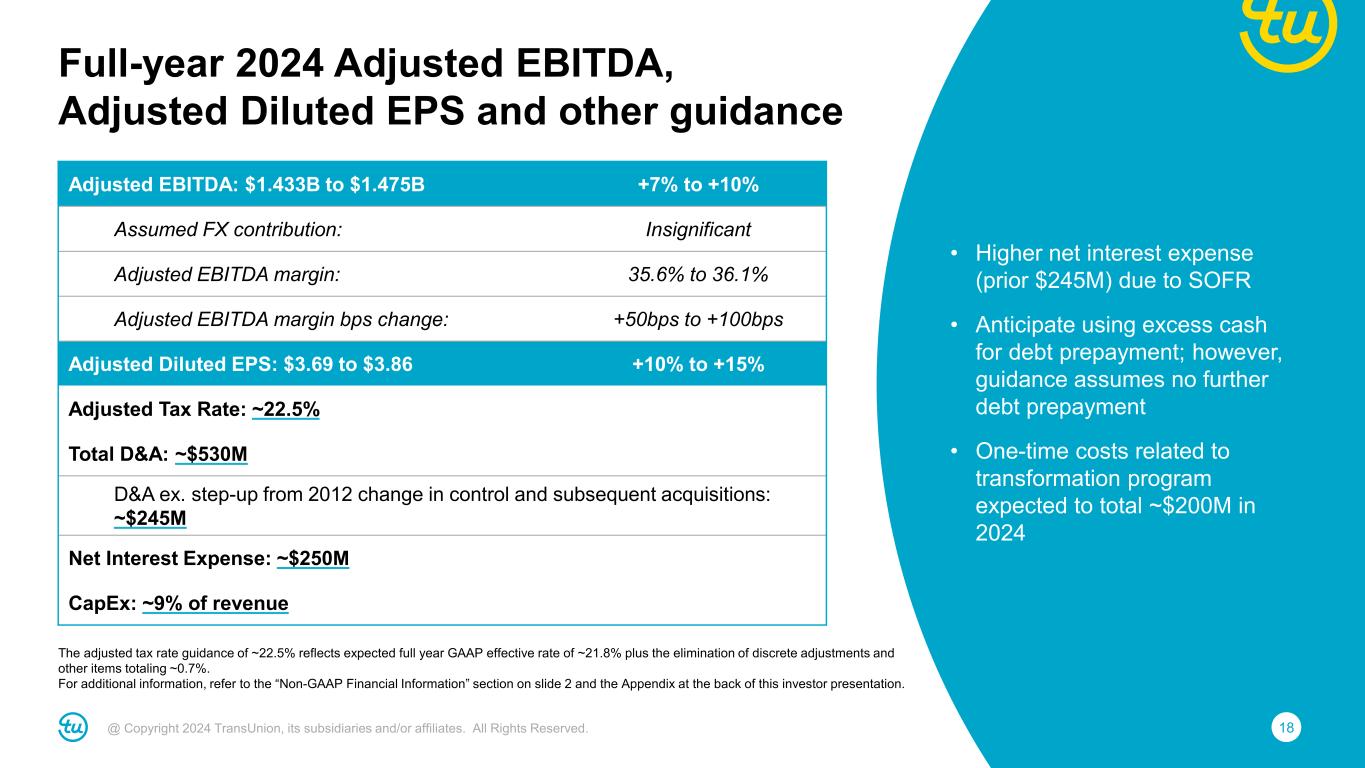 17@ Copyright 2024 TransUnion, its subsidiaries and/or affiliates. All Rights Reserved. Organic Growth Assumptions • Guidance raise driven by better price realization in mortgage • U.S. mortgage: Expect ~50% revenue growth based on ~5% inquiry decline – Expect inquiries to decline ~10% in H1 and flat in H2 – U.S. mortgage was ~8% of LTM revenues Note: For additional information, refer to the “Non-GAAP Financial Information” section on slide 2 and the Appendix at the back of this investor presentation. Full-year 2024 revenue guidance Reported Revenue: $4.023B to $4.083B +5% to +6.5% Assumed M&A contribution: No impact Assumed FX contribution: Insignificant Organic Constant Currency Revenue: +5% to +6.5% Assumed mortgage impact: ~3pt. benefit Organic CC Revenue ex. mortgage: +2% to +3.5% Assumptions • U.S. Markets up mid-single digit (up low-single digit excluding mortgage) – Financial Services up low-double digit (up low-single digit excluding mortgage) – Emerging Verticals up low-single digit – Consumer Interactive down low-single digit • International up low-double digit (constant-currency) Note: For additional information, refer to the “Non-GAAP Financial Information” section on slide 2 and the Appendix at the back of this investor presentation.
