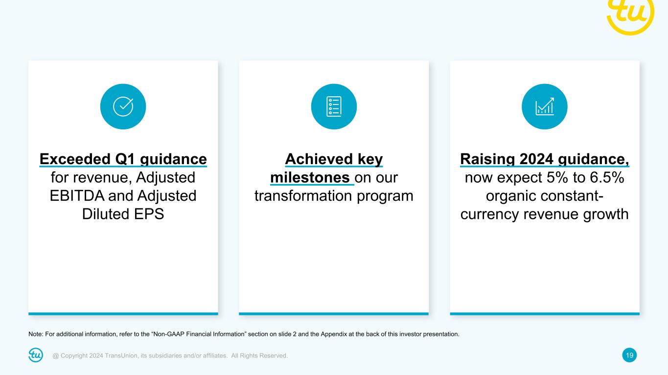 18@ Copyright 2024 TransUnion, its subsidiaries and/or affiliates. All Rights Reserved. • Higher net interest expense (prior $245M) due to SOFR • Anticipate using excess cash for debt prepayment; however, guidance assumes no further debt prepayment • One-time costs related to transformation program expected to total ~$200M in 2024 The adjusted tax rate guidance of ~22.5% reflects expected full year GAAP effective rate of ~21.8% plus the elimination of discrete adjustments and other items totaling ~0.7%. For additional information, refer to the “Non-GAAP Financial Information” section on slide 2 and the Appendix at the back of this investor presentation. Full-year 2024 Adjusted EBITDA, Adjusted Diluted EPS and other guidance Adjusted EBITDA: $1.433B to $1.475B +7% to +10% Assumed FX contribution: Insignificant Adjusted EBITDA margin: 35.6% to 36.1% Adjusted EBITDA margin bps change: +50bps to +100bps Adjusted Diluted EPS: $3.69 to $3.86 +10% to +15% Adjusted Tax Rate: ~22.5% Total D&A: ~$530M D&A ex. step-up from 2012 change in control and subsequent acquisitions: ~$245M Net Interest Expense: ~$250M CapEx: ~9% of revenue