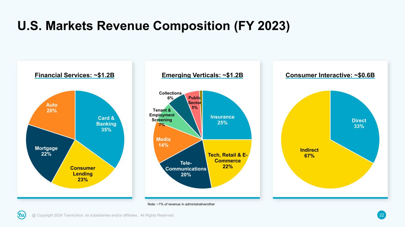 22@ Copyright 2024 TransUnion, its subsidiaries and/or affiliates. All Rights Reserved. U.S. Markets Revenue Composition (FY 2023) Financial Services: ~$1.2B Emerging Verticals: ~$1.2B Consumer Interactive: ~$0.6B Card & Banking 35% Consumer Lending 23% Mortgage 22% Auto 20% Insurance 25% Tech, Retail & E- Commerce 22%Tele- Communications 20% Media 14% Tenant & Employment Screening 7% Collections 6% Public Sector 5% Direct 33% Indirect 67% Note: ~1% of revenue in administrative/other