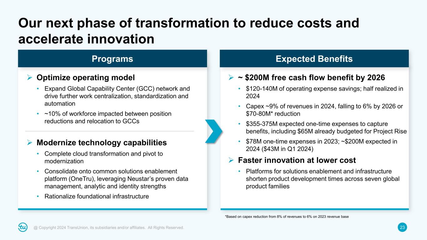 23@ Copyright 2024 TransUnion, its subsidiaries and/or affiliates. All Rights Reserved. Our next phase of transformation to reduce costs and accelerate innovation  Optimize operating model • Expand Global Capability Center (GCC) network and drive further work centralization, standardization and automation • ~10% of workforce impacted between position reductions and relocation to GCCs  Modernize technology capabilities • Complete cloud transformation and pivot to modernization • Consolidate onto common solutions enablement platform (OneTru), leveraging Neustar’s proven data management, analytic and identity strengths • Rationalize foundational infrastructure  ~ $200M free cash flow benefit by 2026 • $120-140M of operating expense savings; half realized in 2024 • Capex ~9% of revenues in 2024, falling to 6% by 2026 or $70-80M* reduction • $355-375M expected one-time expenses to capture benefits, including $65M already budgeted for Project Rise • $78M one-time expenses in 2023; ~$200M expected in 2024 ($43M in Q1 2024)  Faster innovation at lower cost • Platforms for solutions enablement and infrastructure shorten product development times across seven global product families *Based on capex reduction from 8% of revenues to 6% on 2023 revenue base Programs Expected Benefits