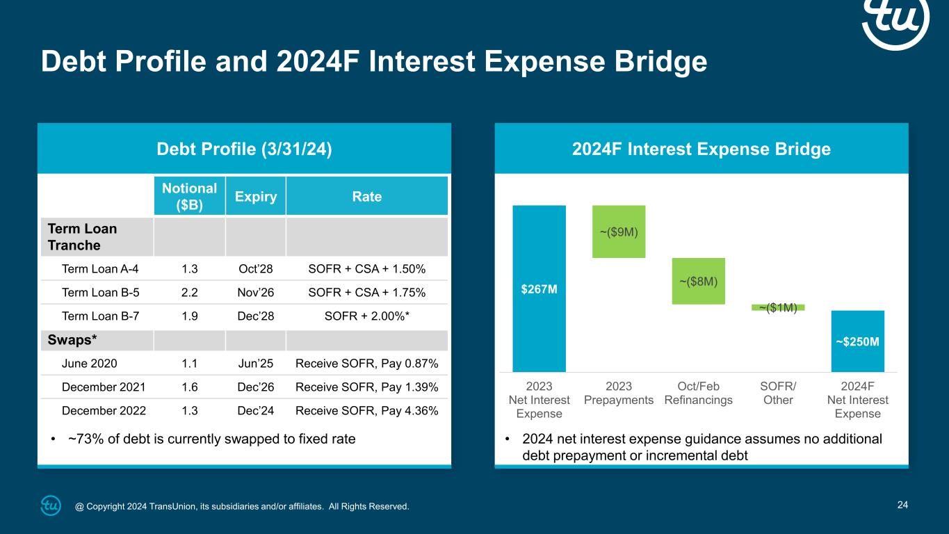 @ Copyright 2024 TransUnion, its subsidiaries and/or affiliates. All Rights Reserved. 24 Debt Profile and 2024F Interest Expense Bridge Debt Profile (3/31/24) 2024F Interest Expense Bridge Notional ($B) Expiry Rate Term Loan Tranche Term Loan A-4 1.3 Oct’28 SOFR + CSA + 1.50% Term Loan B-5 2.2 Nov’26 SOFR + CSA + 1.75% Term Loan B-7 1.9 Dec’28 SOFR + 2.00%* Swaps* June 2020 1.1 Jun’25 Receive SOFR, Pay 0.87% December 2021 1.6 Dec’26 Receive SOFR, Pay 1.39% December 2022 1.3 Dec’24 Receive SOFR, Pay 4.36% • ~73% of debt is currently swapped to fixed rate • 2024 net interest expense guidance assumes no additional debt prepayment or incremental debt $267M ~$250M ~($9M) ~($8M) ~($1M) 2023 Net Interest Expense 2023 Prepayments Oct/Feb Refinancings SOFR/ Other 2024F Net Interest Expense