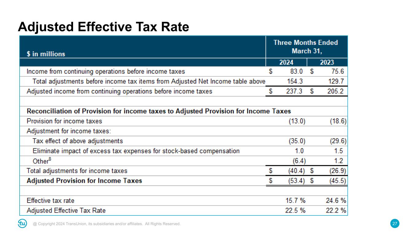 27@ Copyright 2024 TransUnion, its subsidiaries and/or affiliates. All Rights Reserved. Adjusted Effective Tax Rate